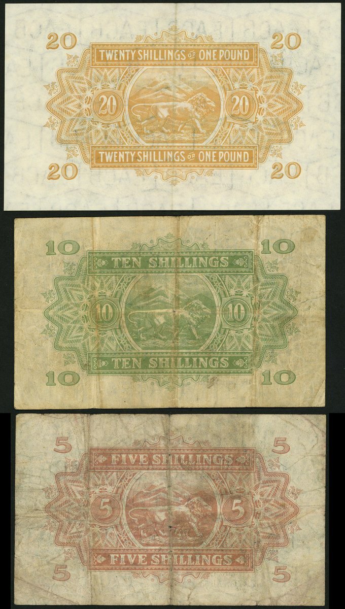 East African Currency Board, 20 shillings, Nairobi, 1 January 1955, serial number E82 12830, orange brown, Elizabeth II at top right, value at top left, at centre and at each corner, signatures of Beresford-Stooke, David, Fisher and Galworthy, reverse orange-brown, lion at centre, also 5 shillings, 1953 and 10 shillings, 1953