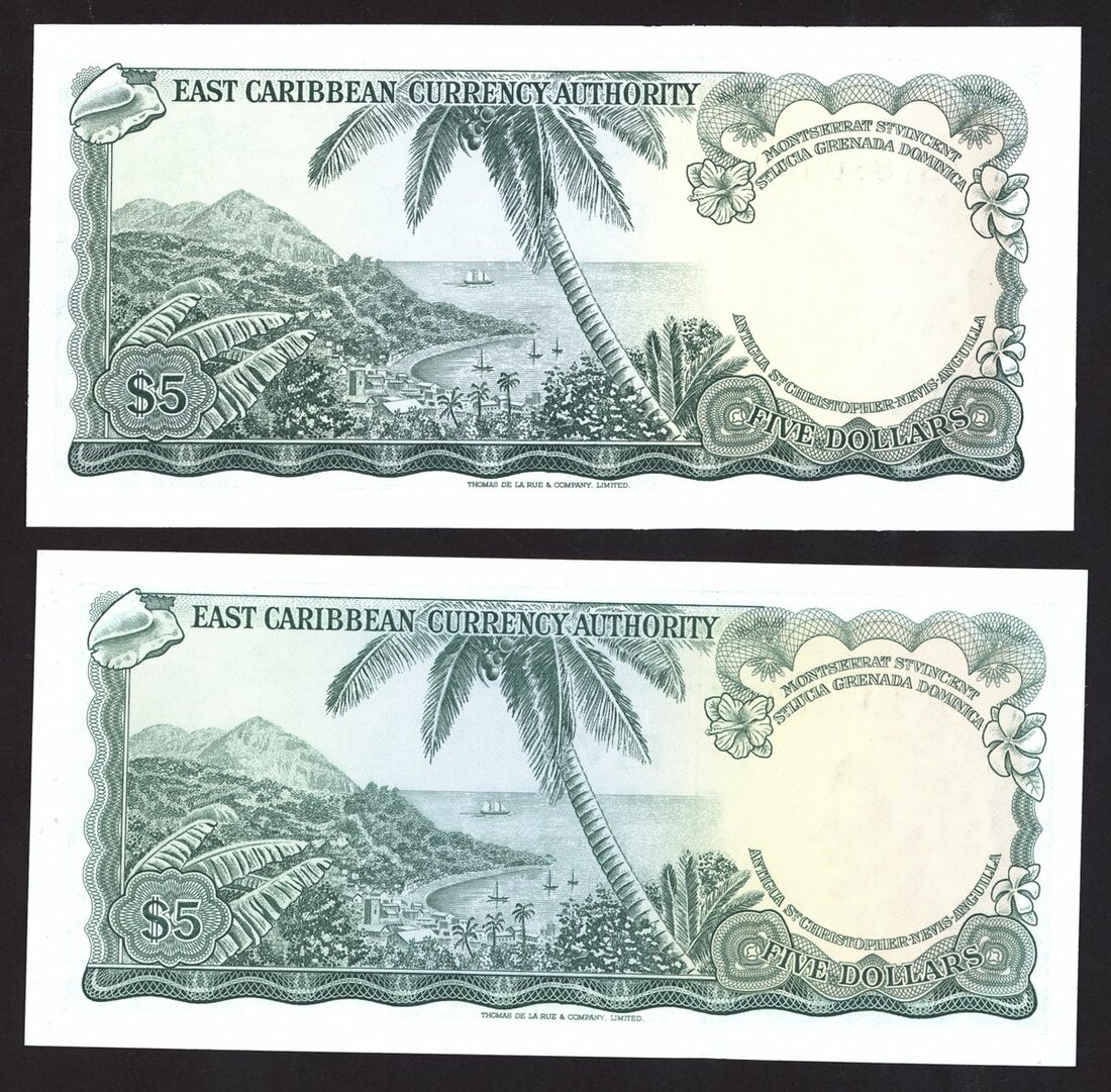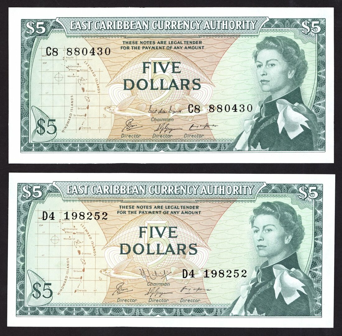East Caribbean Currency Authority, $5 (2), ND (1965), prefix C8, D4, (Pick 14g, 14h, TBB B102c8, c9), uncirculated (2 notes)