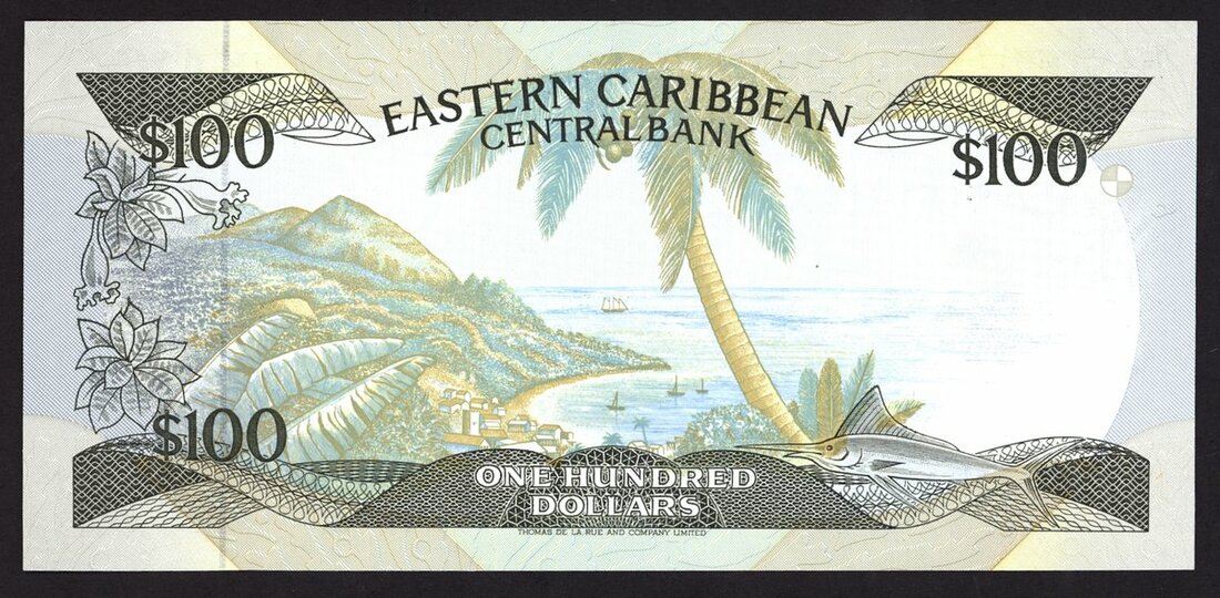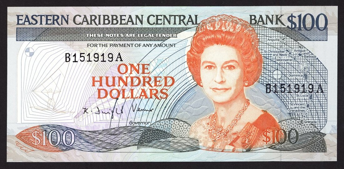 Eastern Caribbean Central Bank, $100, ND (1989-), serial number B 151919 A (Antigua and Barbuda), red and multicoloured, Elizabeth II at right, map of the islands at right, signature of Dwight Venner