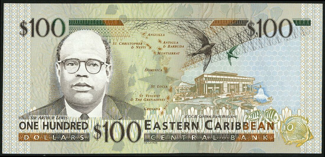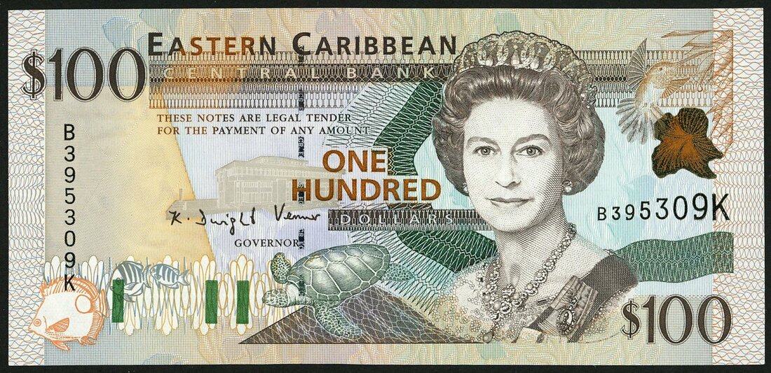 Eastern Caribbean Central Bank, $100, ND (1998), serial number B 395309 K, Saint Kitts, brown, green and pale blue, Elizabeth II at right, Venner signature, foil flower top right