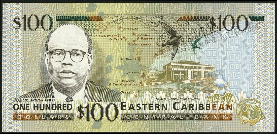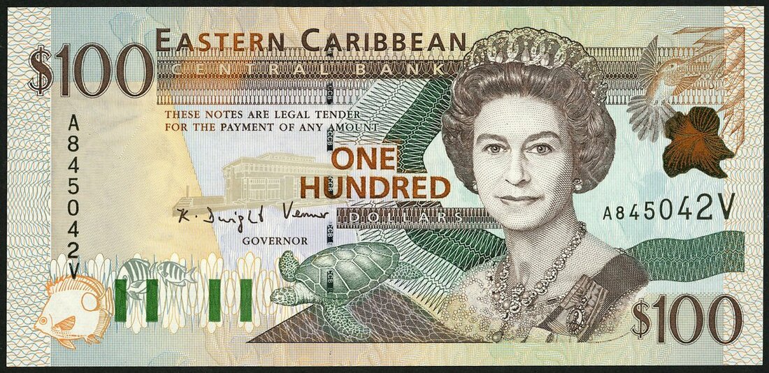 Eastern Caribbean Central Bank, $100, ND (1998), serial number A 845042 V, Saint Vincent, brown, green and pale blue, Elizabeth II at right, Venner signature, foil flower top right