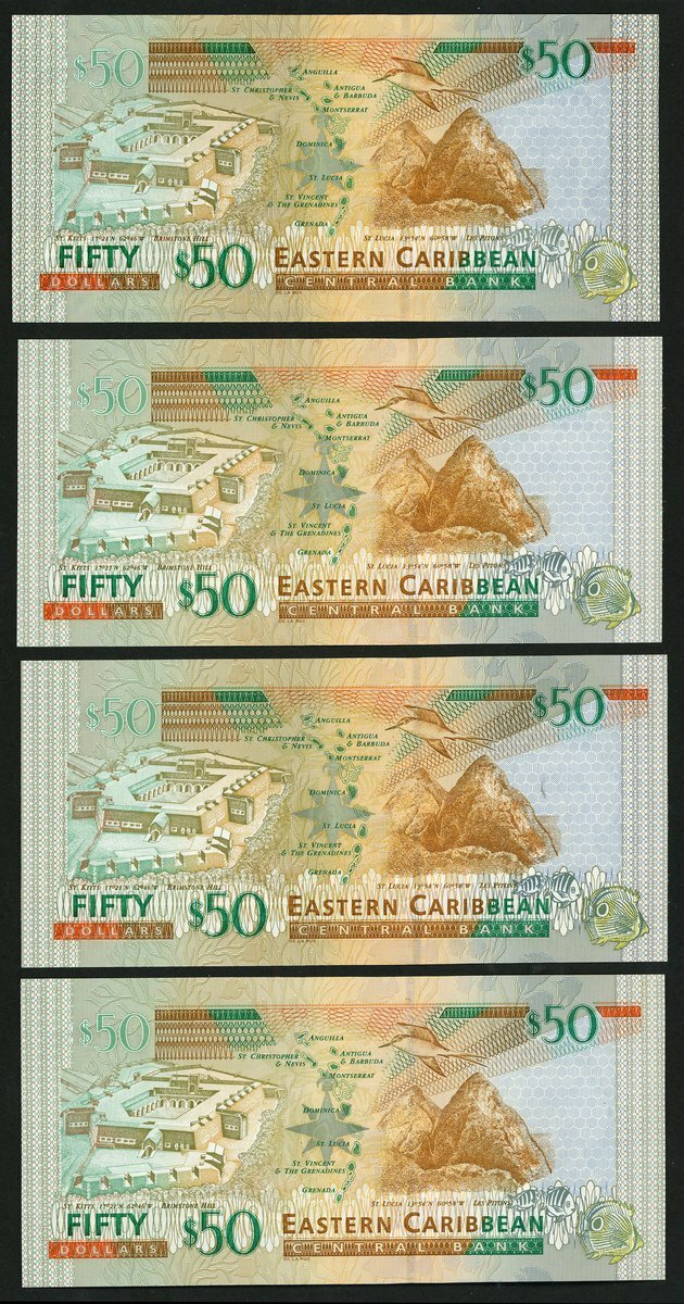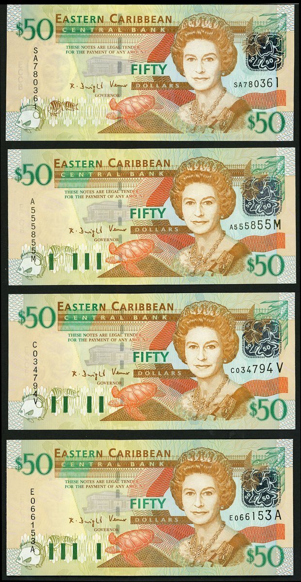 Eastern Caribbean Central Bank, $50 (3), ND (2004), brown, Elizabeth II at right, Venner signature, foil flower top right, also $50 , ND (2008)