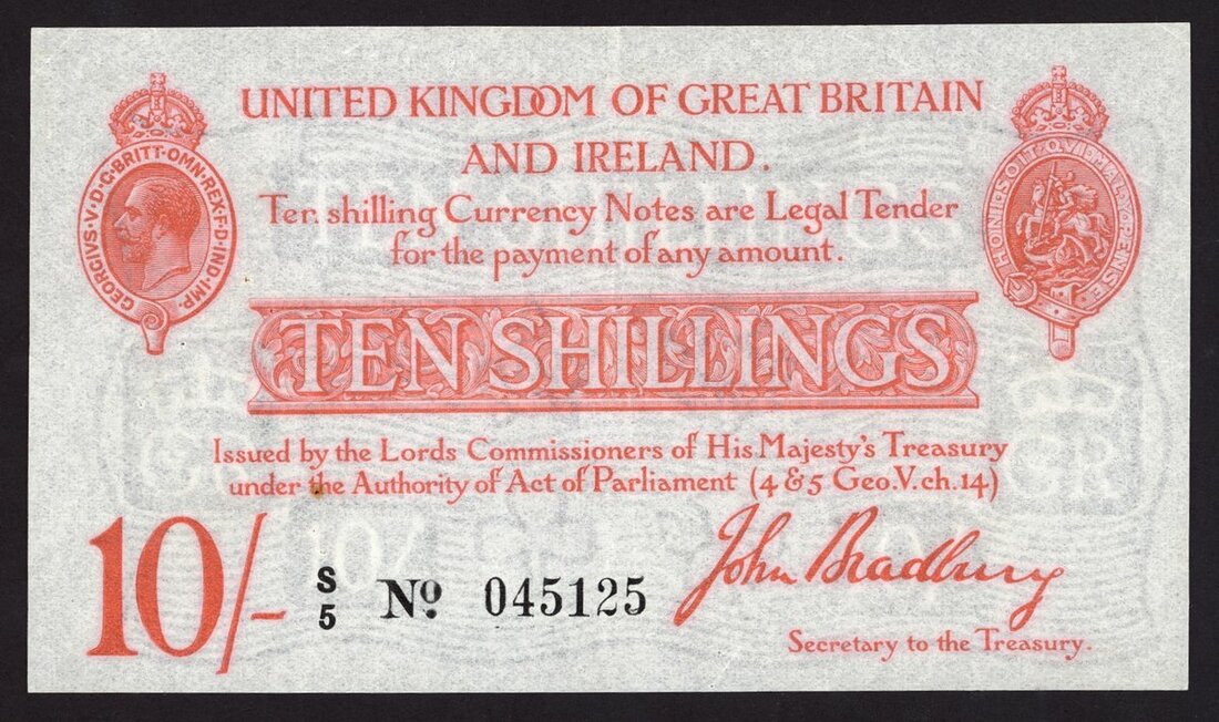 Treasury Series, John Bradbury, second issue 10 shillings, ND (21 January 1915), serial number S/5 045125, red and white, crowned head of George V top left, crowned vignette of Saint George and the dragon top right, value in red tablet at centre