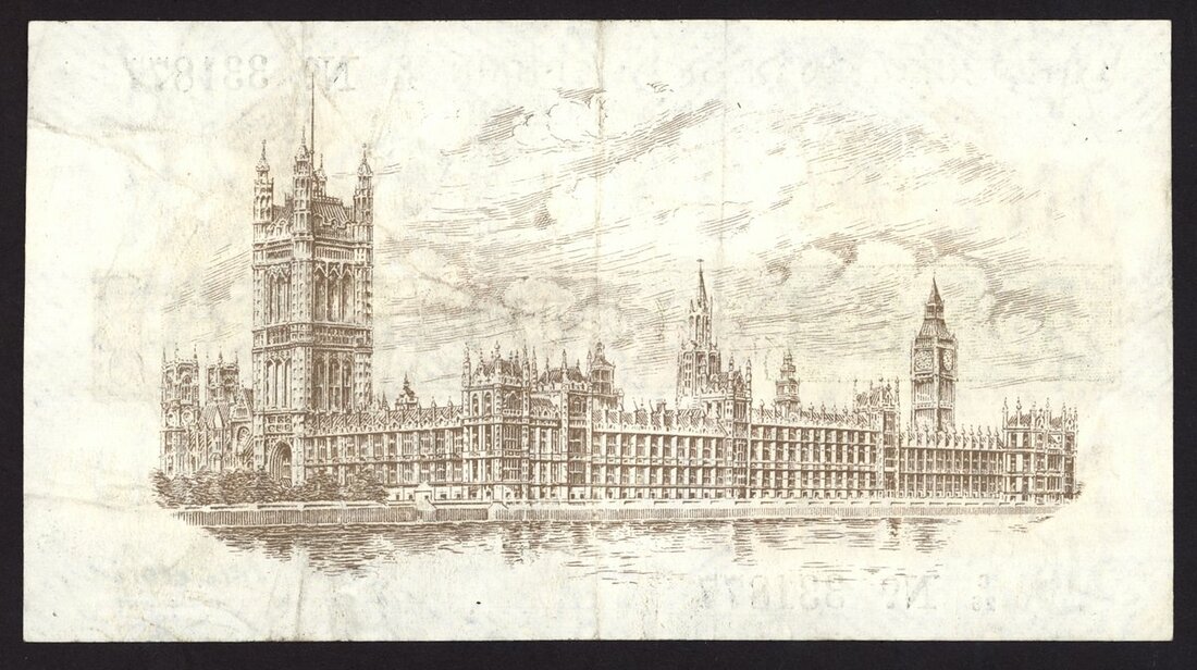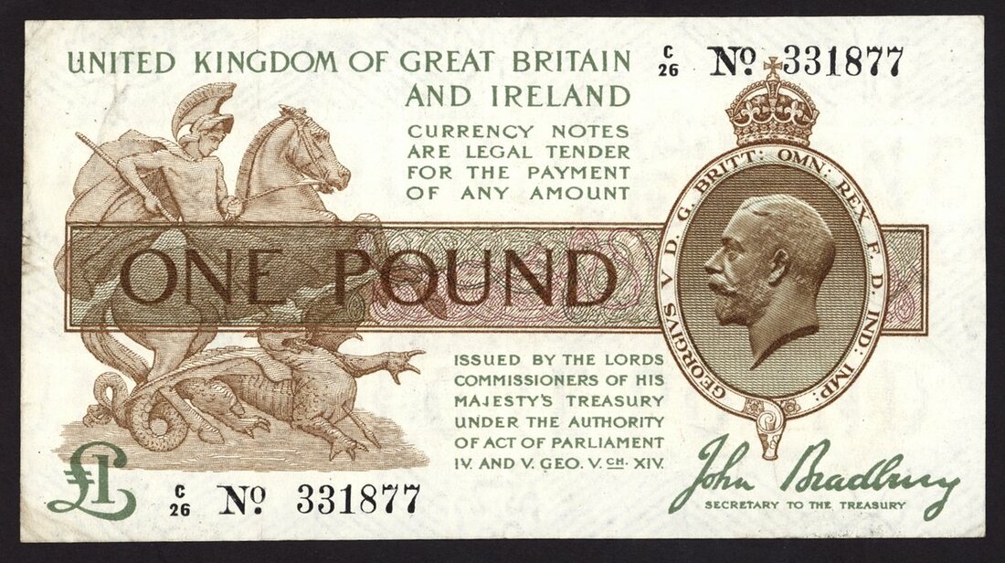 Treasury Series, John Bradbury (1914-1919), third issue, £1, ND (22 January 1917), serial number C/26 331877, green, brown, lilac and white, St. George and the Dragon at left, crowned head of George V in oval frame at right, value in central panel, reverse brown and white, the Houses of Parliament,