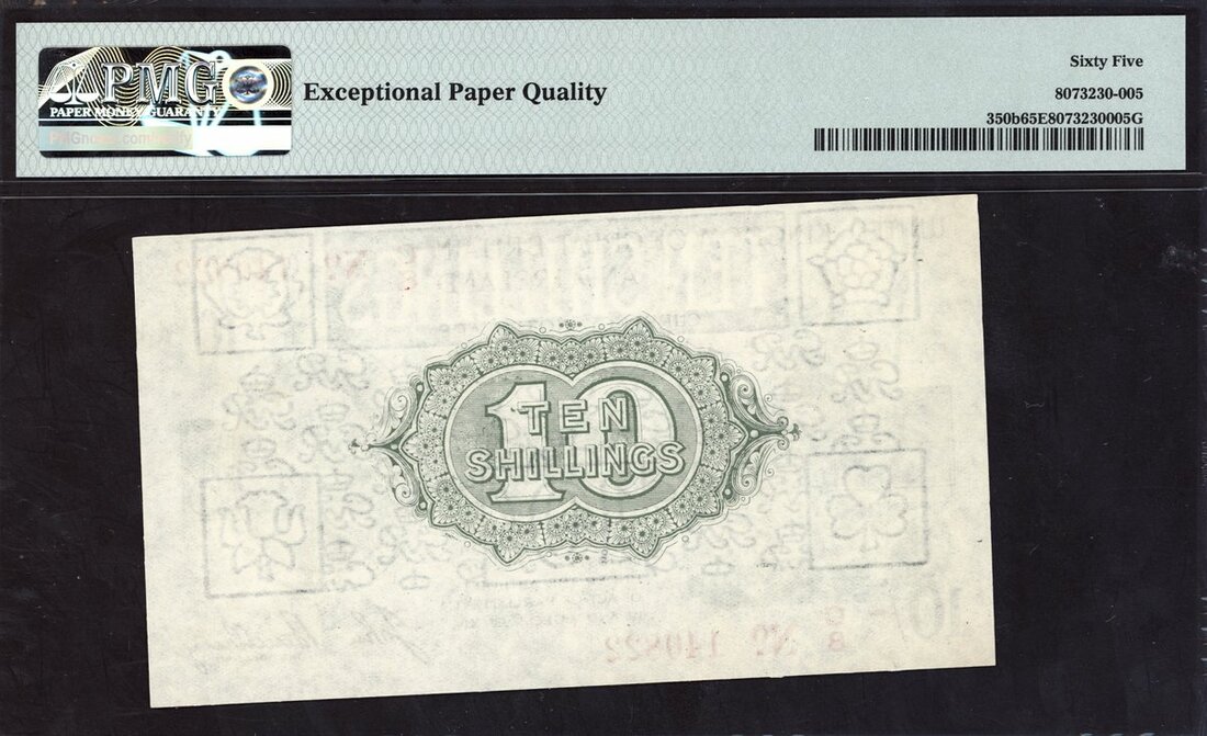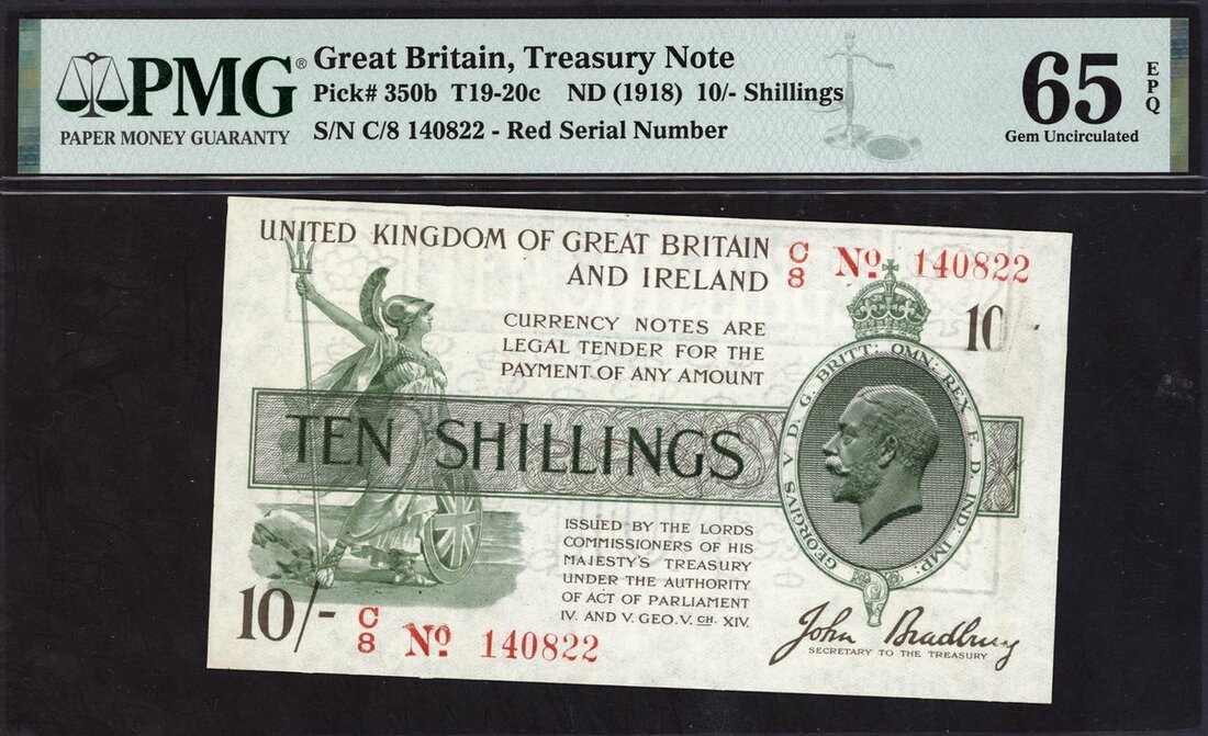 Treasury Series, John Bradbury, third issue 10 shillings, ND (16 December 1918), red serial number C8 140822, green, lilac and white, Britannia at left with Union shield and trident, crowned head of George V in oval frame at right, denomination in lilac central panel, reverse denomination in green central guilloche,