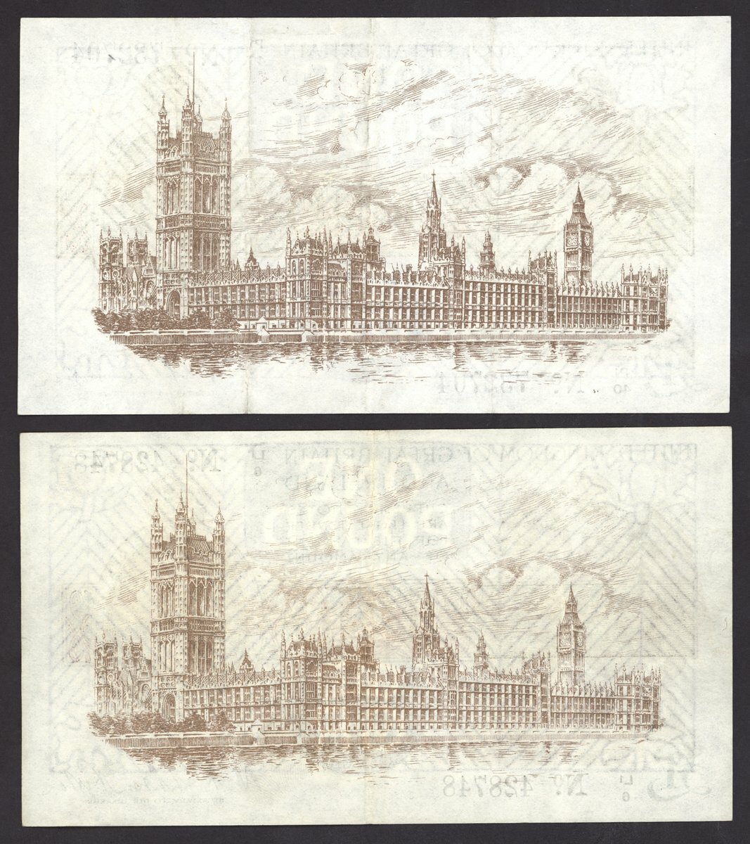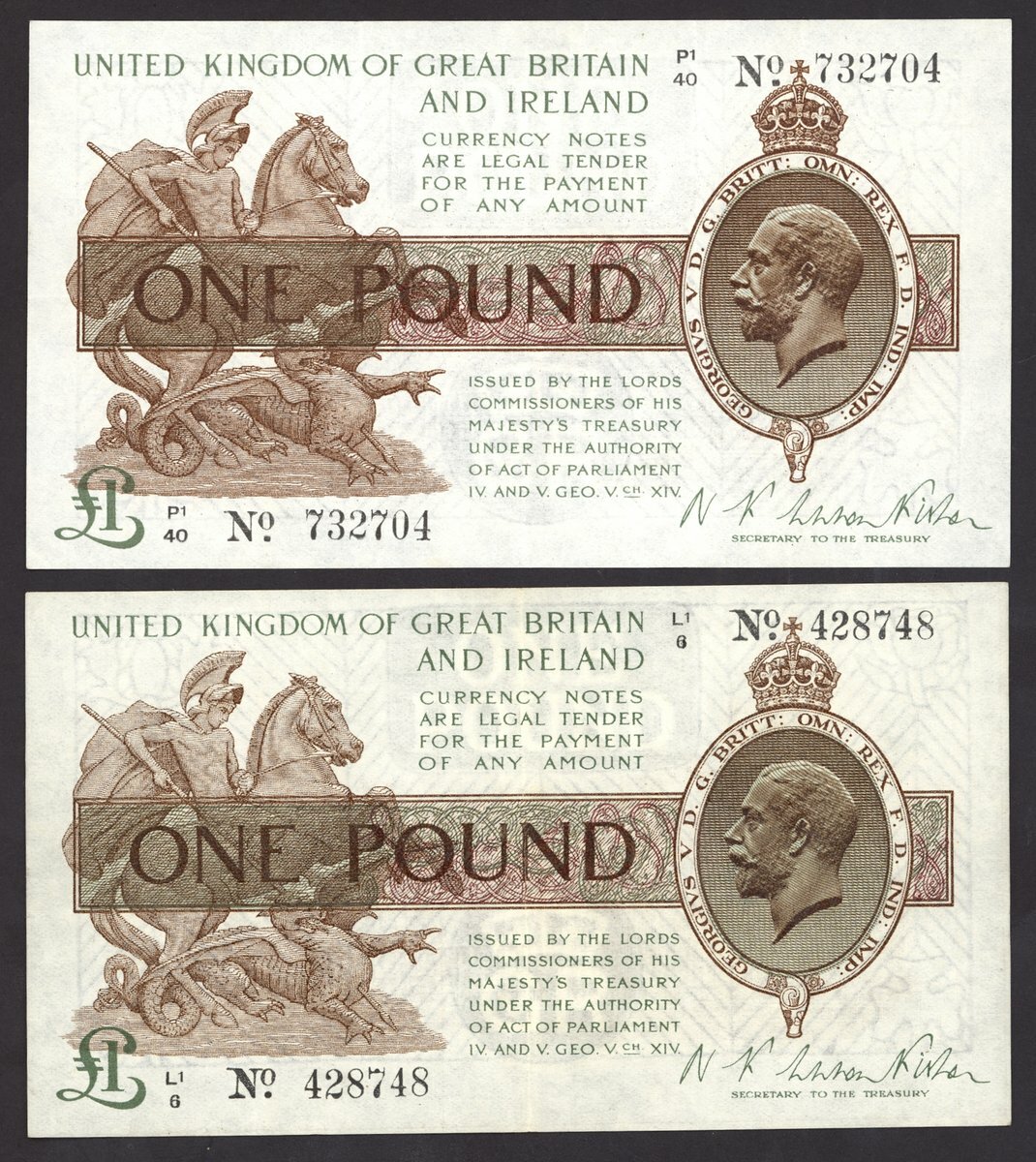 Treasury Series, N.F. Warren-Fisher (1919-1928), first issue (2), £1, ND (30 September 1919), prefixes L1/6 and P1/40, green, brown, lilac and white, St. George and the Dragon at left, crowned head of George V in oval frame at right, value in central panel, reverse brown and white, the Houses of Parliament