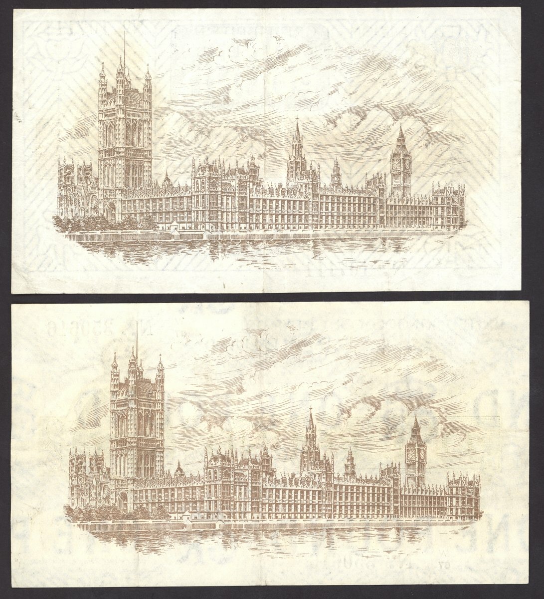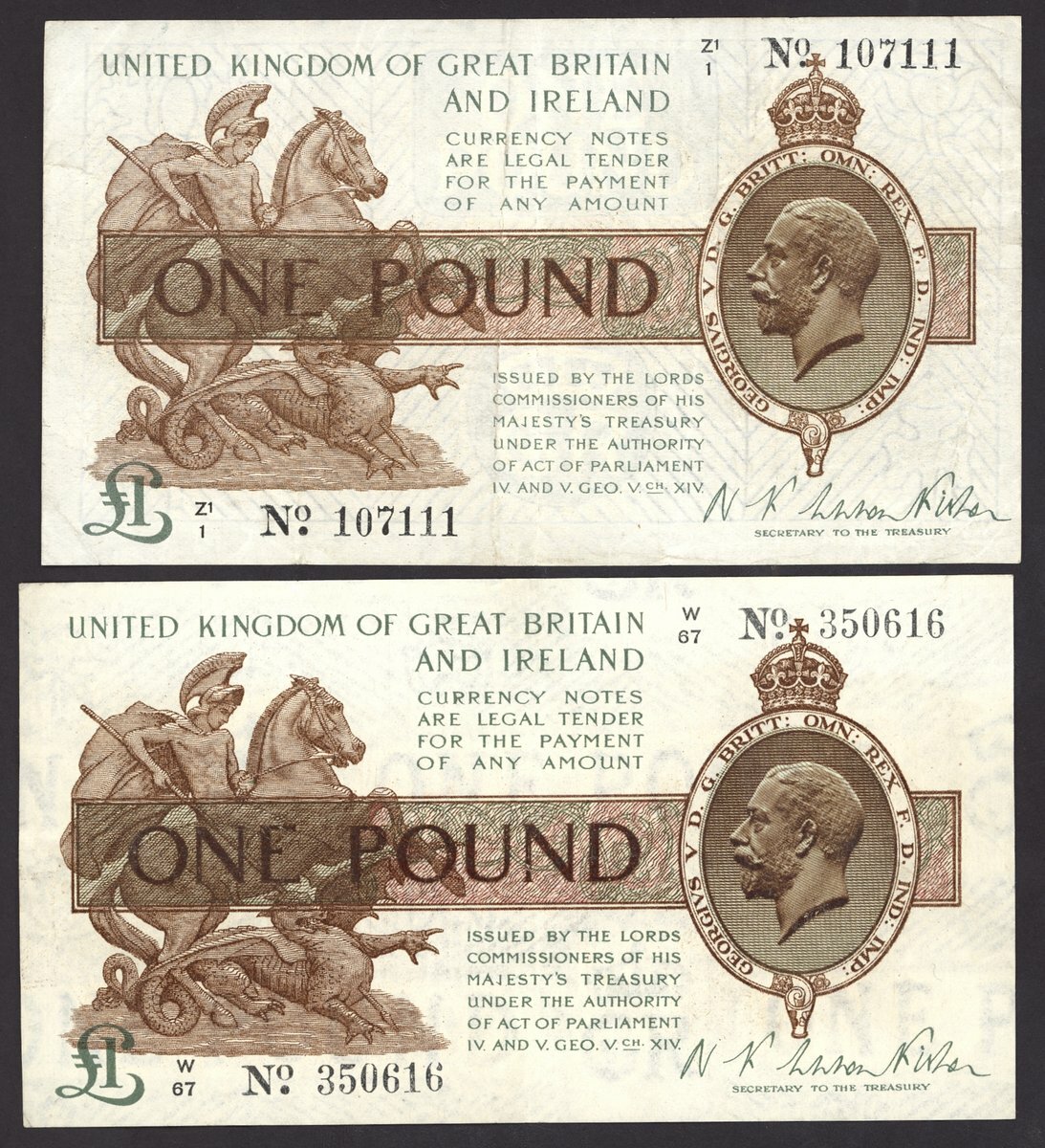 Treasury Series, N.F.Warren-Fisher (1919-1928), first issue, £1, ND (30 September 1919), prefix W/67, green, brown, lilac and white, St. George and the Dragon at left, crowned head of George V in oval frame at right, value in central panel, reverse brown and white, the Houses of Parliament, also a £1 with prefix Z1/1 (control note)