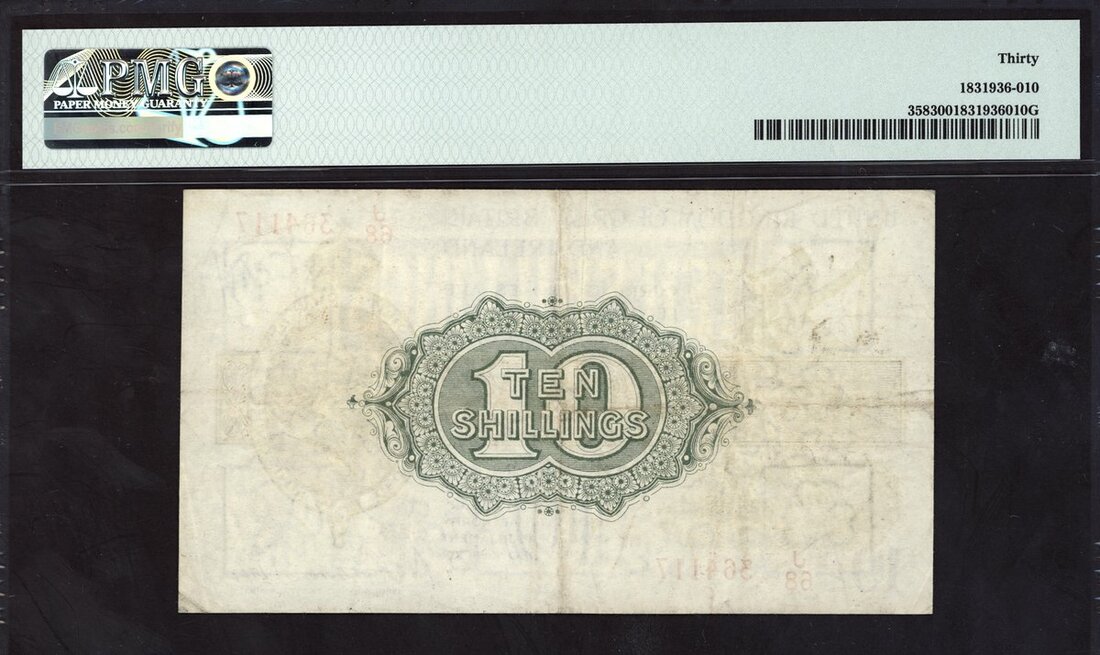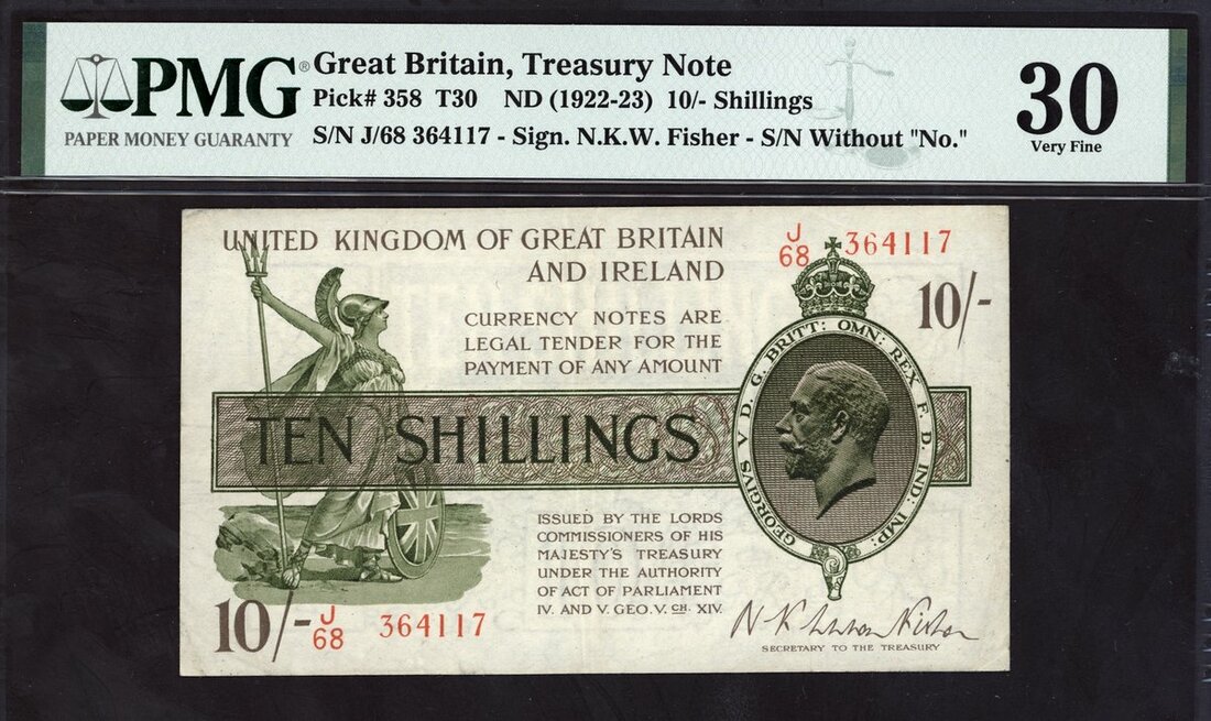 Treasury Series, N.F.Warren-Fisher, second issue first series, 10 shillings, ND (6 November 1922), red serial number J68 364117, green, lilac and white, Britannia at left with Union shield and trident, crowned head of George V in oval frame at right, denomination in lilac central panel, reverse denomination in green central guilloche,