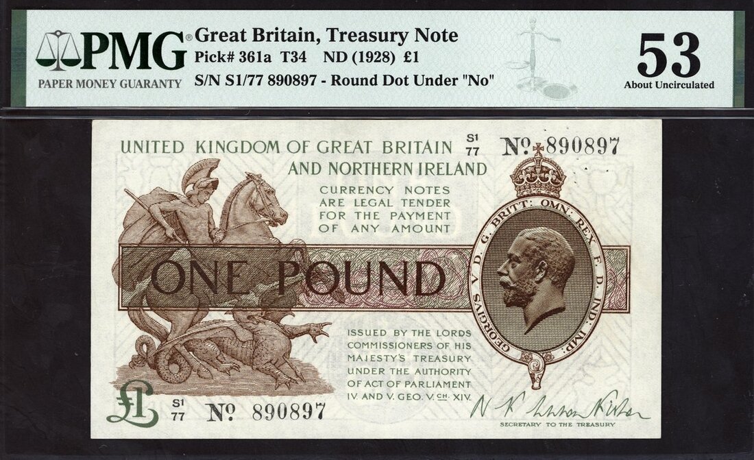 Treasury Series, N.F. Warren-Fisher, Third Issue, first series £1, ND (1928), serial number S1/77 890897, dark green, brown, lilac & white, St. George and the Dragon at left, George V at right