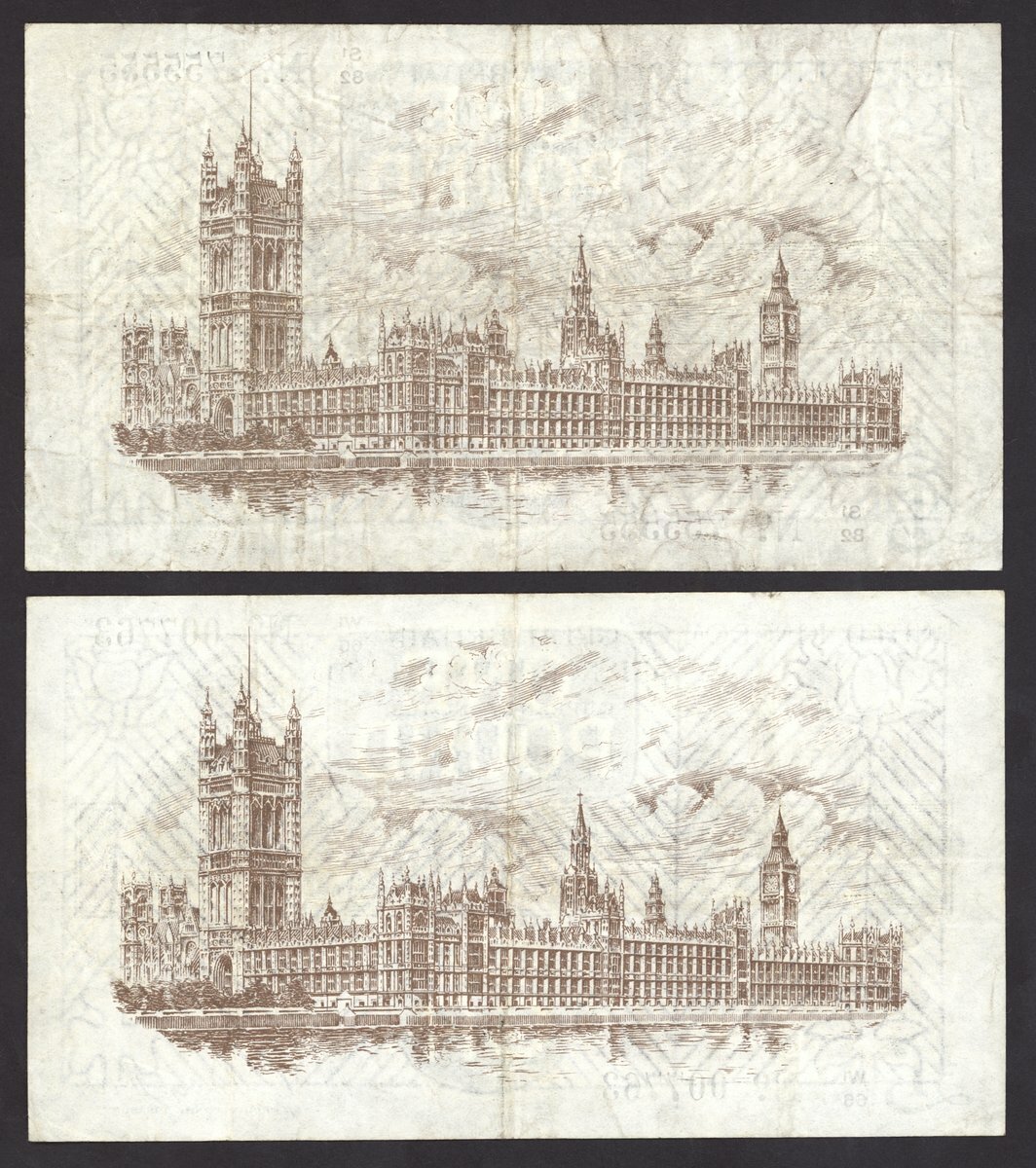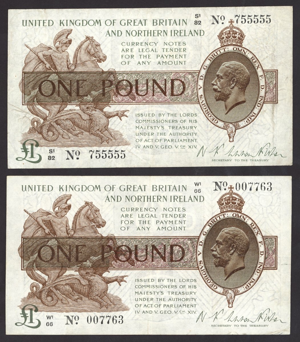 Treasury Series, N.F.Warren-Fisher (1919-1928), third issue £1 (2), ND (25 July 1927),  prefixes  S1/82 and W1/66, green, brown, lilac and white, St. George and the Dragon at left, crowned head of George V in oval frame at right, value in central panel, NORTHERN IRELAND type, reverse brown and white, the Houses of Parliament