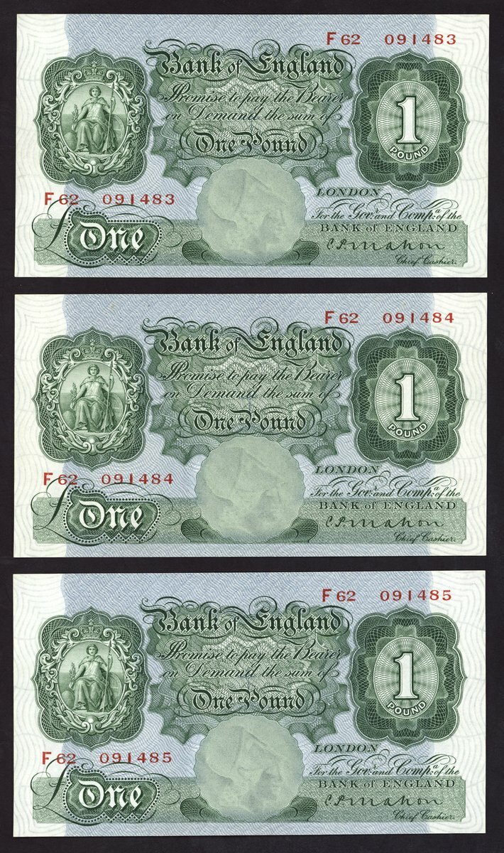 Bank of England, C.P. Mahon, consecutive £1 (3), ND (1928), serial numbers F62 091483/84/85, (EPM B212), original, minor handling, about uncirculated. Rare early group of Mahon £1 (3 notes)