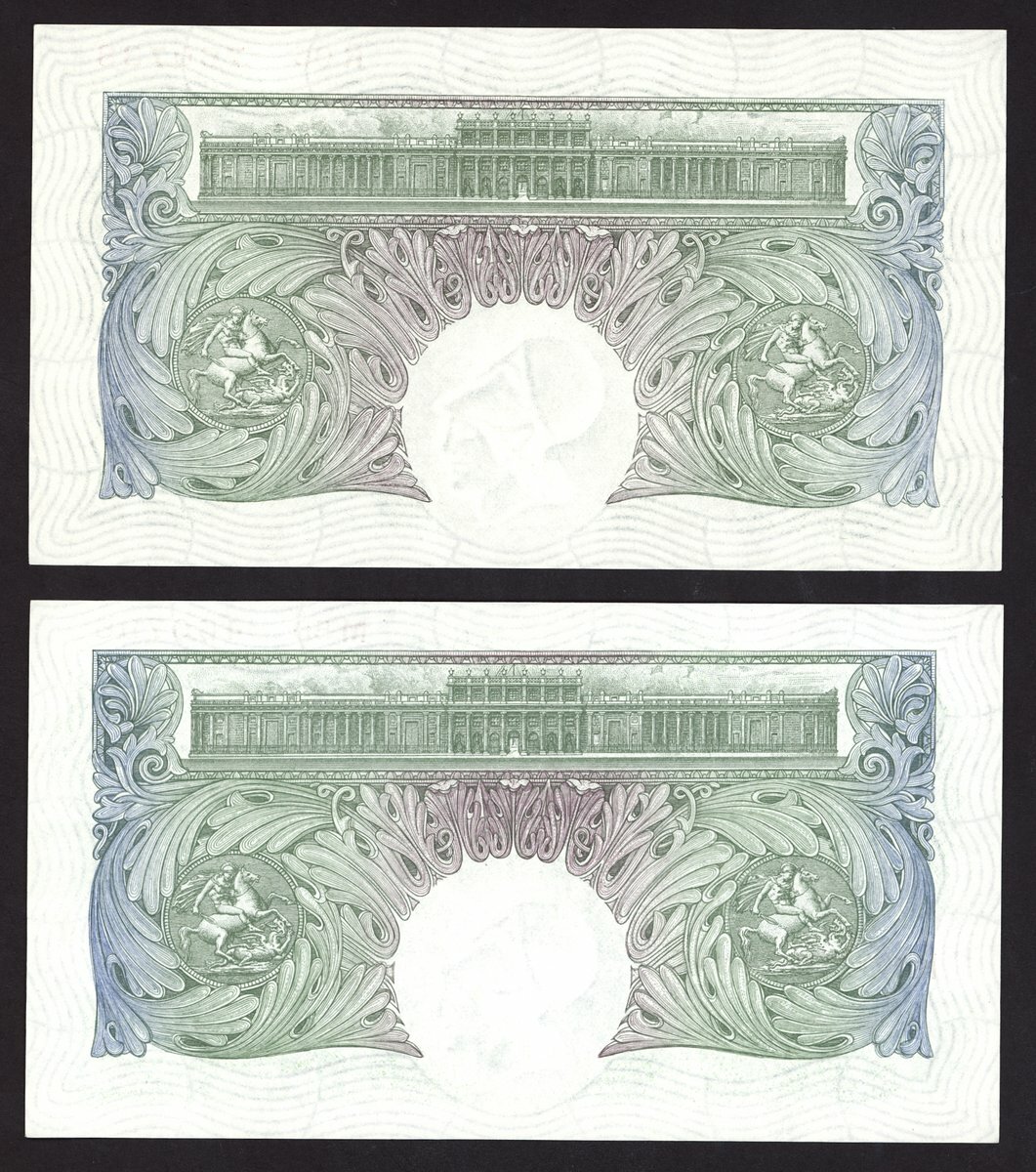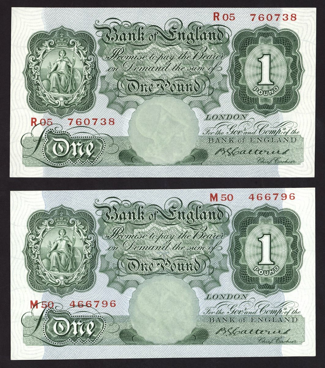 Bank of England, Basil Gage Catterns, £1 (2), ND (1930), prefixes M 50 and R 05, green, Britannia at left, value at right