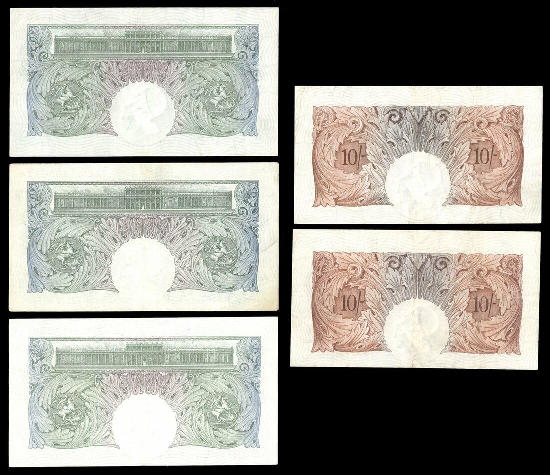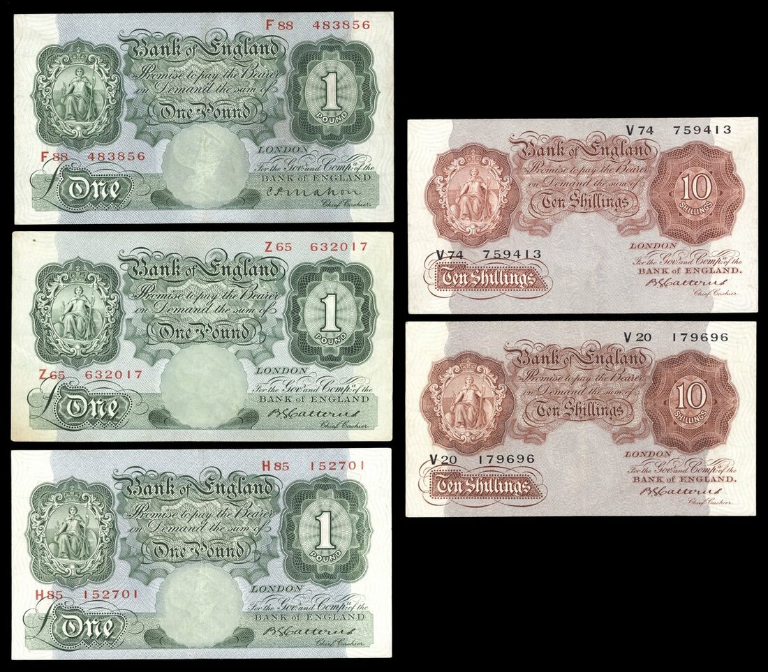 Bank of England, Cyril Patrick Mahon, £1, ND (1928), prefix F/88, also Basil Gage Catterns £1 (2), ND (1930), prefixes H75 and Z65, all green and pale blue, Britannia at right, value at left, also 10 shillings (2), prefix V20, V74, brown