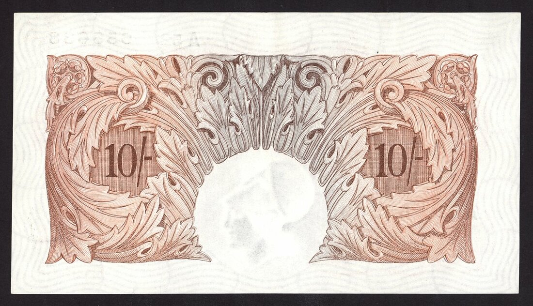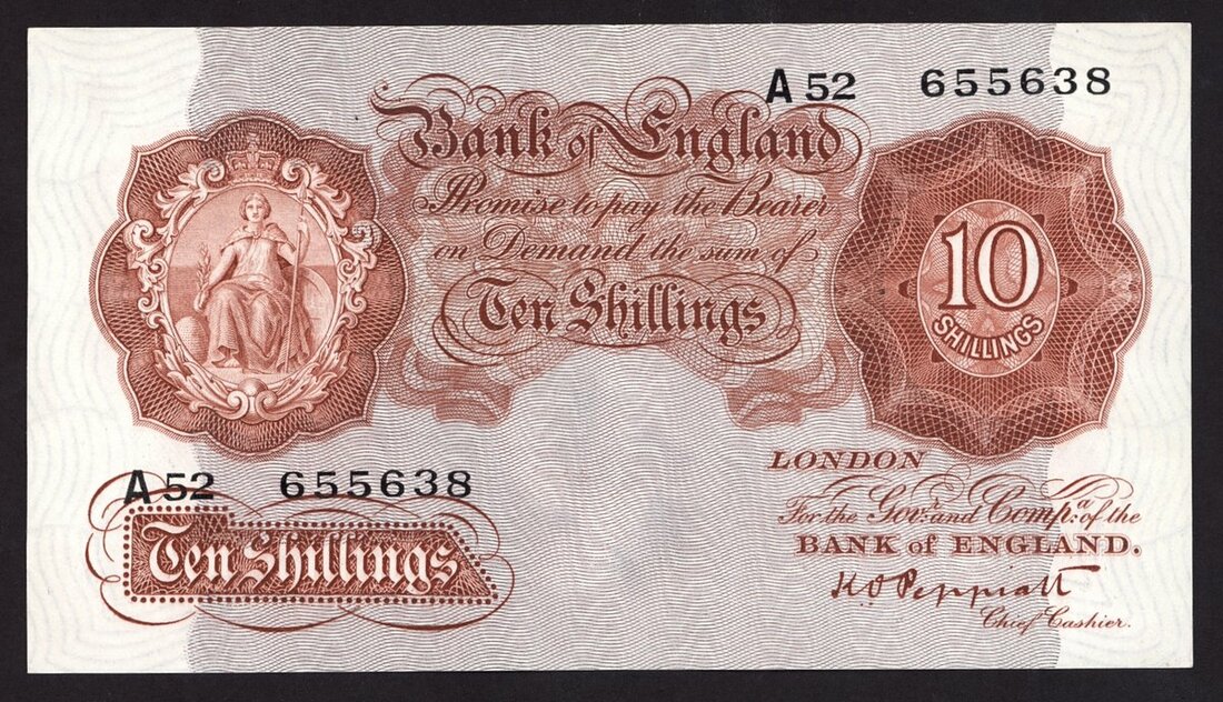 Bank of England, Kenneth Oswald Peppiatt, 10 shillings, ND (1934), serial number A52 655638, brown, Britannia at left, value at right
