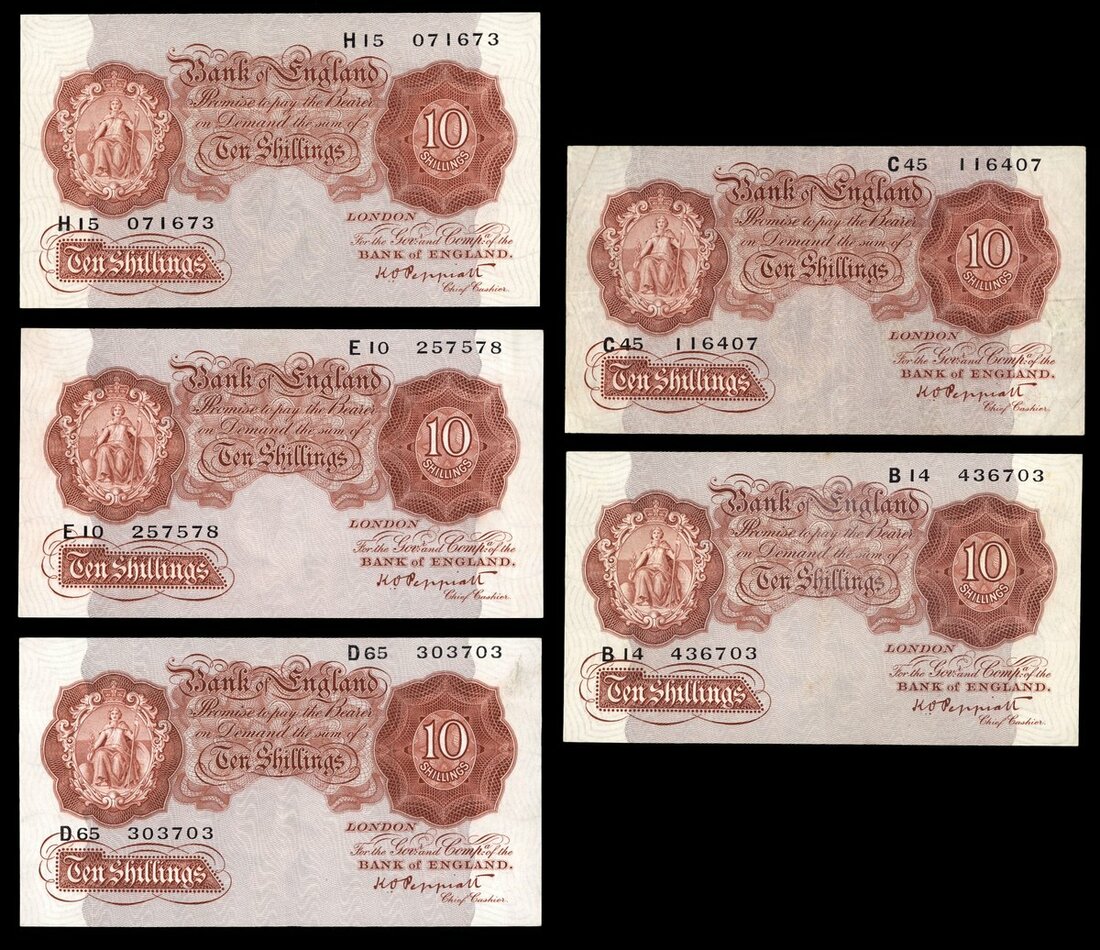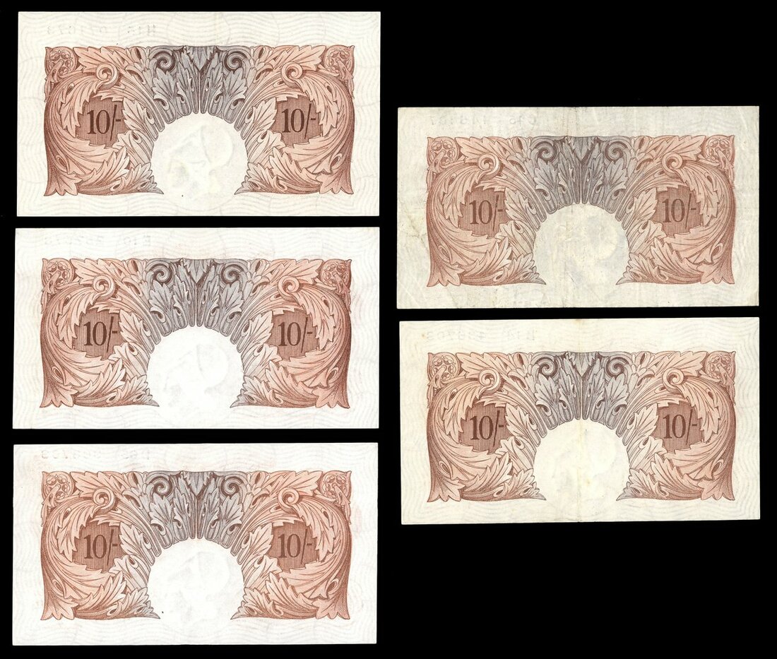 Bank of England, K.O. Peppiatt, 10 shillings (5), ND (1934), prefixes H15, E10, D65, C45, B14, (EPM B235), D45 aunc, C45 VF, others lightly pressed EF (5 notes)