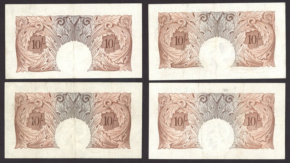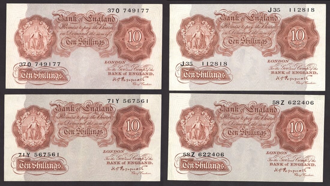 Bank of England, K.O. Peppiatt, 10 shillings (4), ND (1934/1948), prefixes J35, 71Y, 58Z, 37O, brown, Britannia at right, value at left