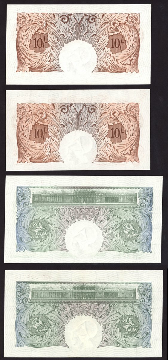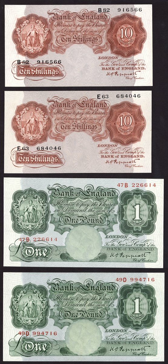 Bank of England, Kenneth Oswald Peppiatt, 10 shillings (2), ND (1934), prefix E63, B82, brown, also £1 (2), ND (1934), prefix 47B, 49D, green