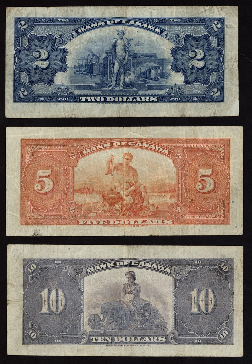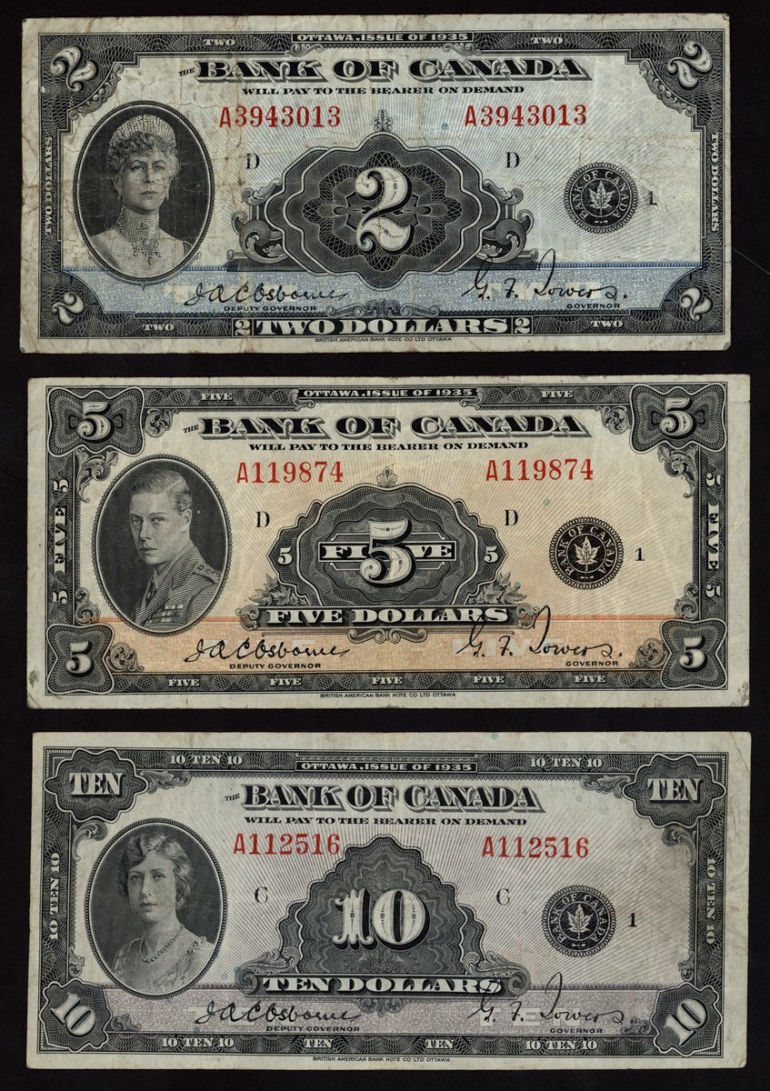 Bank of Canada, 1935 English issue, including $2, $5, $10, (Pick 40, 42, 44), $2 fine, remaining very fine (3 notes)