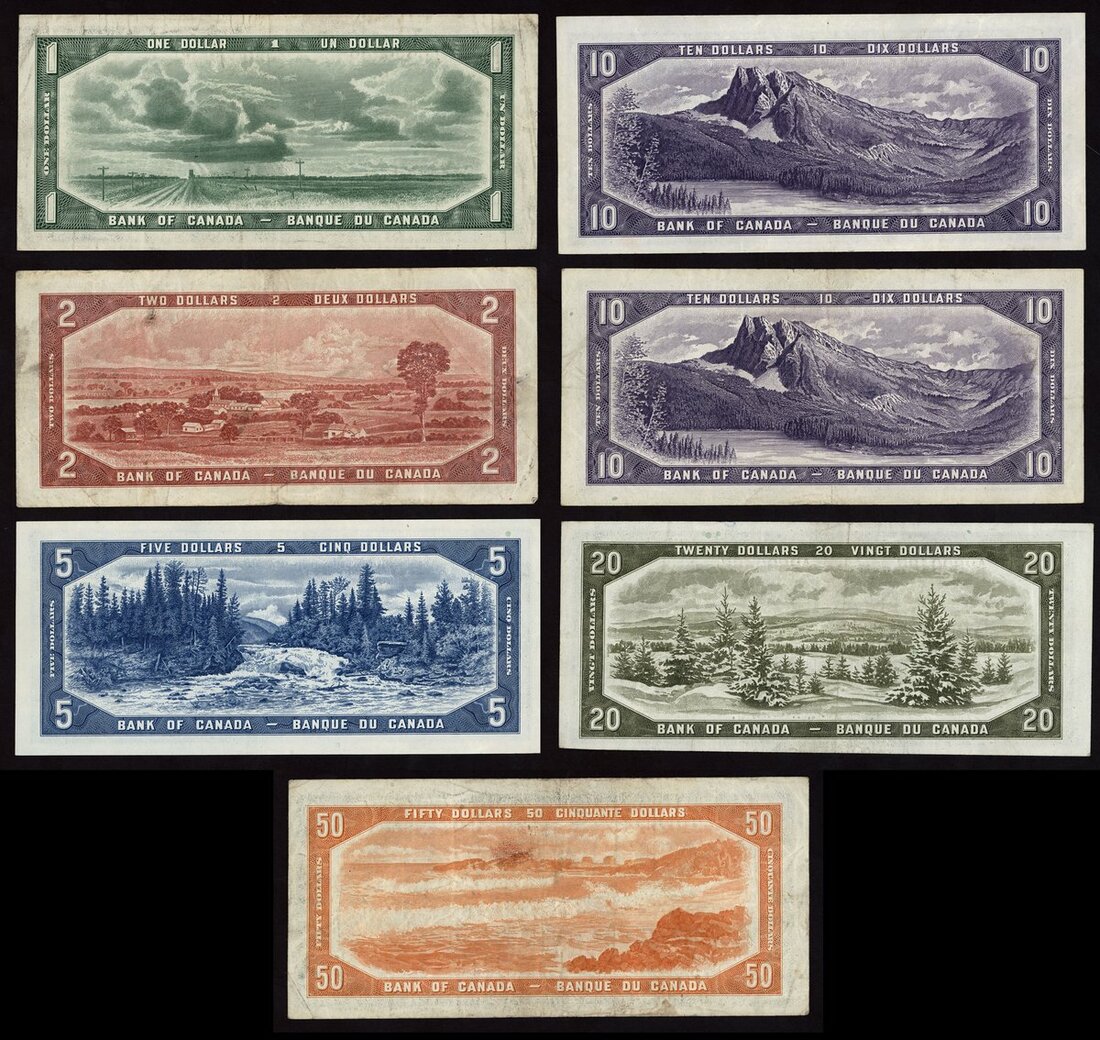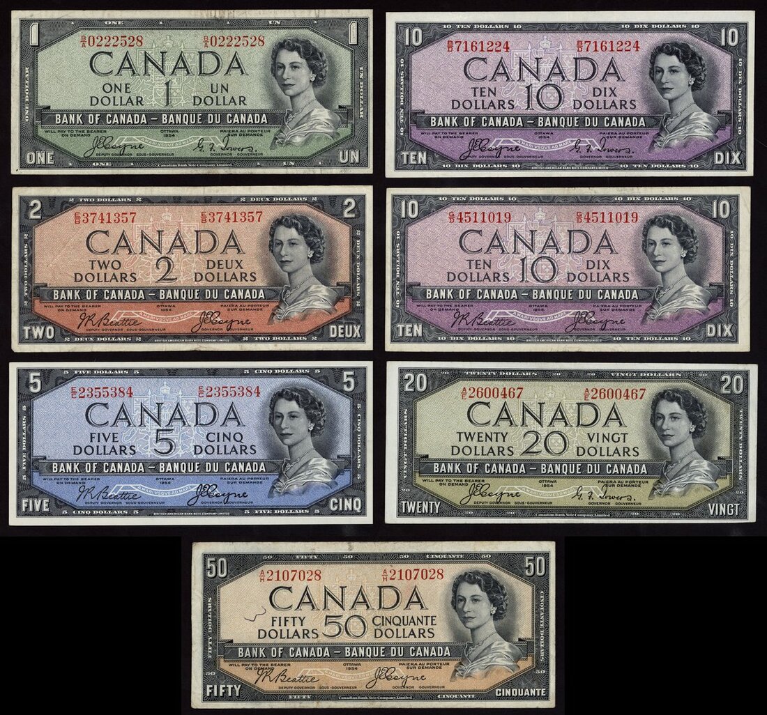 Bank of Canada, a group of the 1954 Devil's Face issues, including $1 (2), $2, $5, $10 (2), $20, $50,