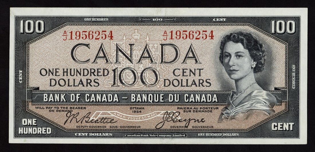 Bank of Canada, $100, 1954, serial number A/J 1956254, (Pick 72b, Charlton BC-35b), extremely fine