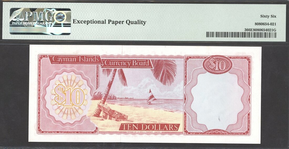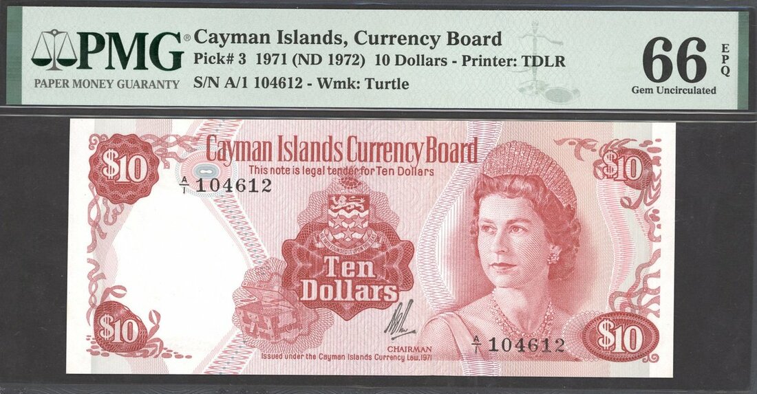 (x) Cayman Islands Currency Board, $10, ND (1972), serial number A/1 104612, (Pick 3, TBB B103), in PMG holder 66 EPQ Gem Uncirculated