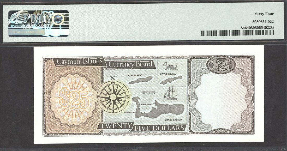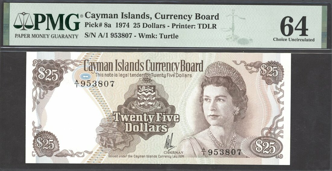 (x) Cayman Islands Currency Board, $25, 1981, serial number A/1 953807, (Pick 8a, TBB B108), in PMG holder 64 Choice Uncirculated
