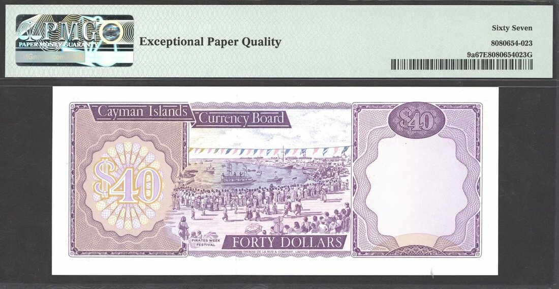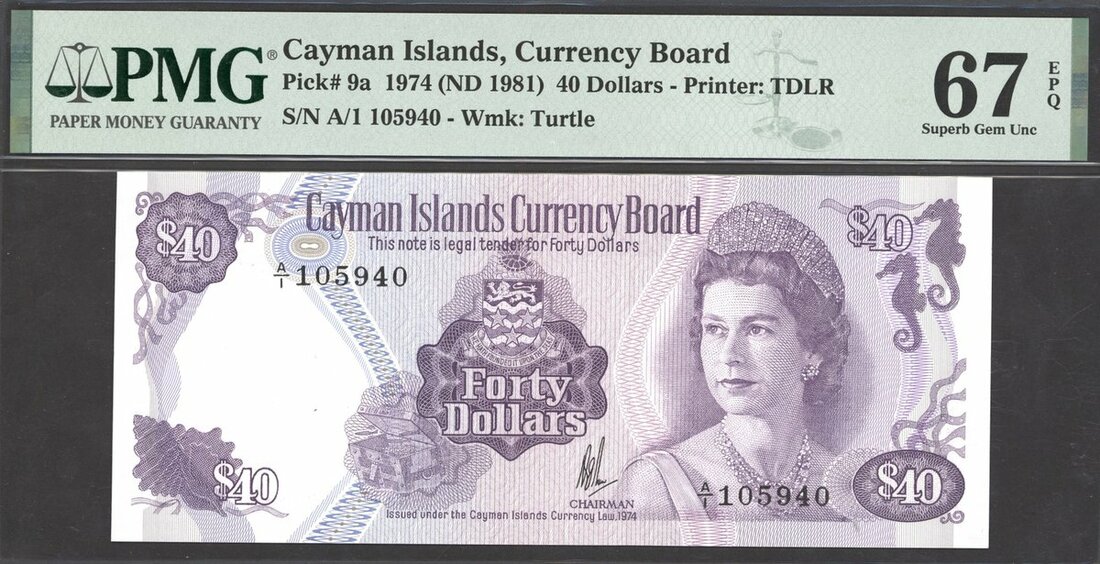 (x) Cayman Islands Currency Board, $40, ND (1981), serial number A/1 105940, (Pick 9a, TBB B109), in PMG holder 67 EPQ Superb Gem Unc, rare with 2 examples in a higher grade, and an interesting denomination