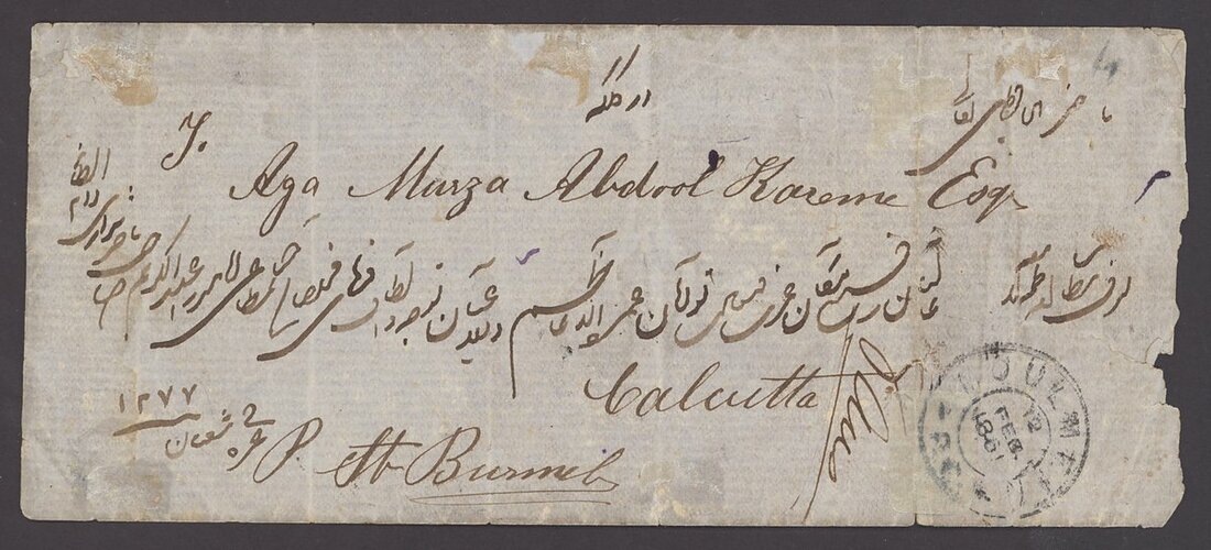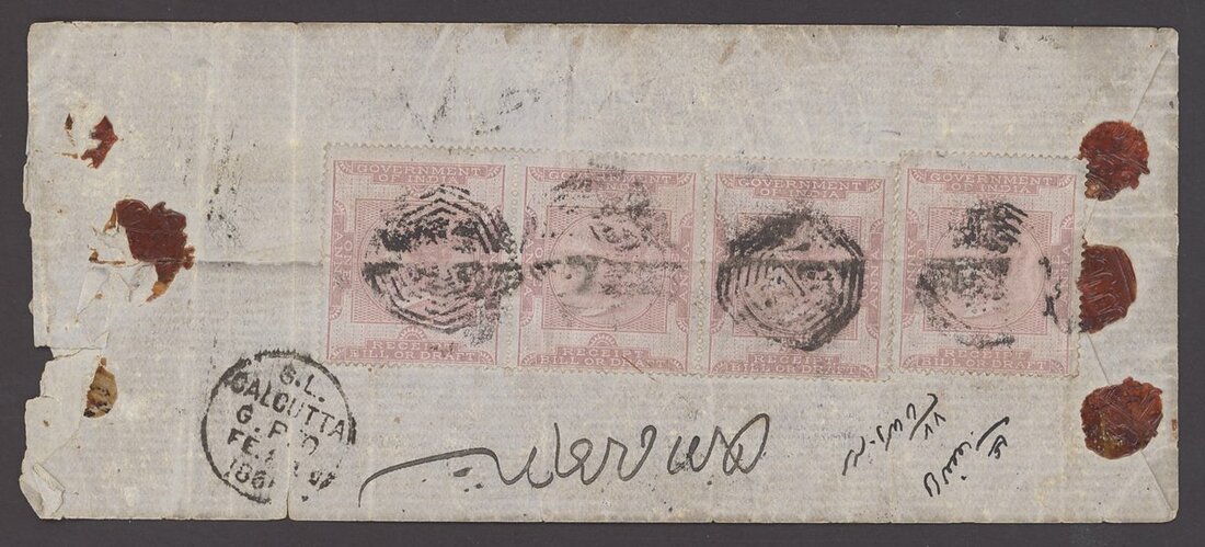 1861 (12 Feb.) native envelope to Calcutta bearing, on reverse, Receipt Bill or Draft 1a. lilac on blued paper strip of three and single, each cancelled "B/127" with arrival datestamp alongside and showing, on face,