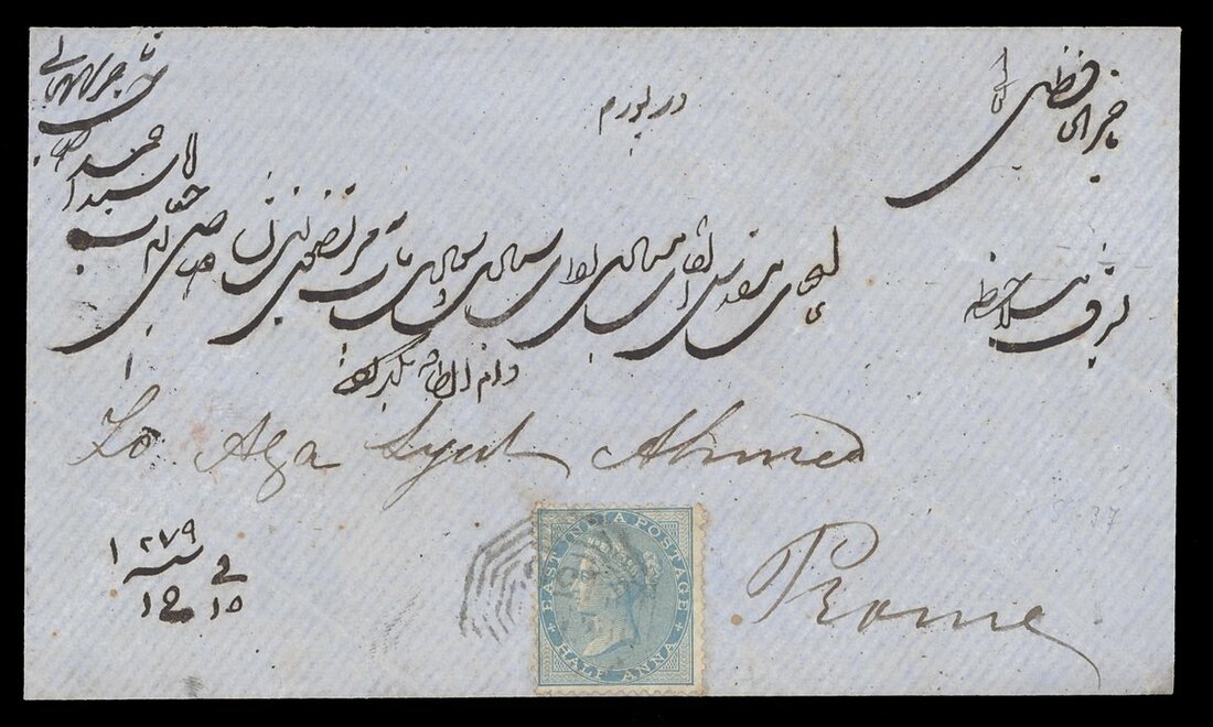 1859 (20 Nov.) envelope to Prome, bearing ½a. tied by legible "B/136" (Type K2) and showing red arrival datestamp on reverse; the envelope with piece of flap missing. Rare, thought to be one of two recorded covers
