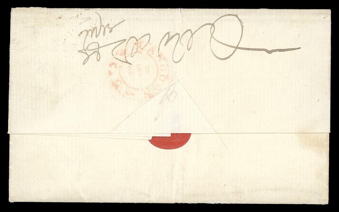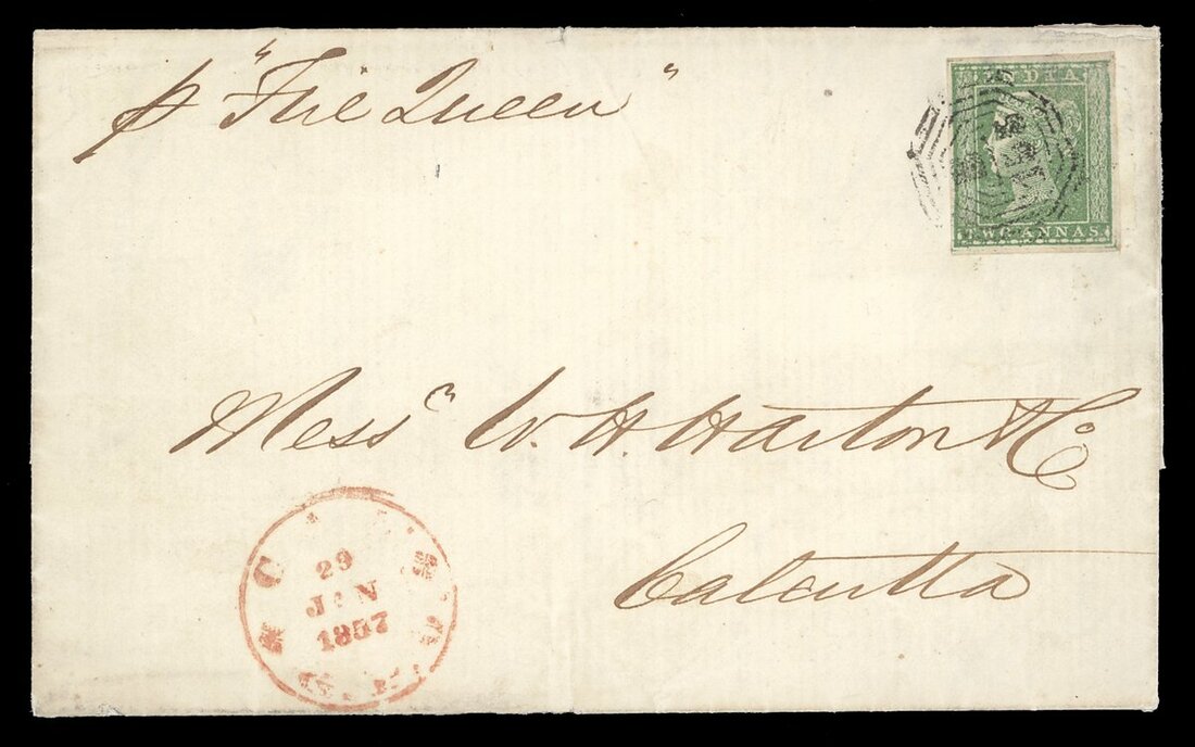 1857 (19 Jan.) entire letter to Calcutta, marked "p Fire Queen", bearing 1854 2a. with clear to good margins tied by "B/156" obliterator, showing arrival c.d.s. in opposite corner and, on reverse, light