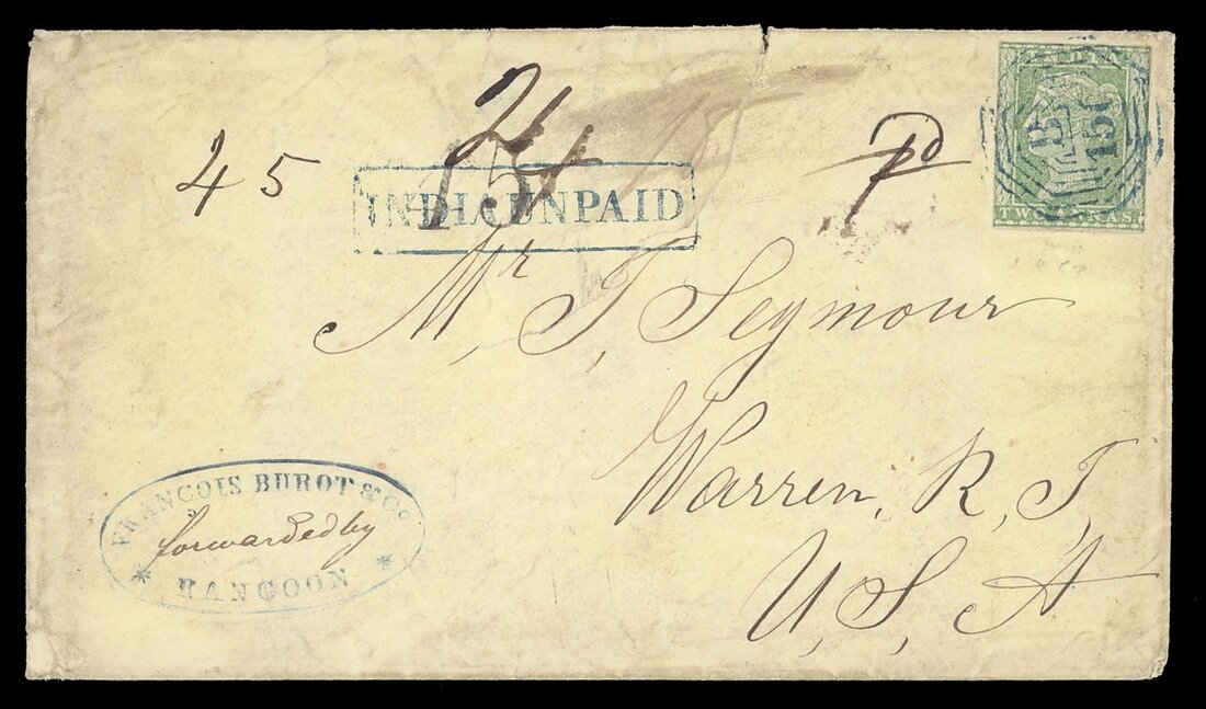1857 (July) envelope to USA, bearing 1854 2a. tied by "B/156" obliterator in blue paying the Indian internal rate, showing framed
