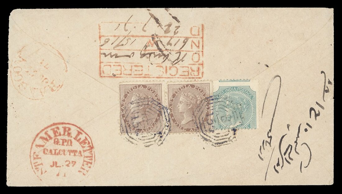 1871 (22 July) envelope registered from Rangoon to Calcutta bearing, on reverse, 1a. pair and 4a. tied by "B/156" obliterator, showing light despatch c.d.s., Type R4 registration h.s. and arrival c.d.s. alongside, all struck in red. Attractive