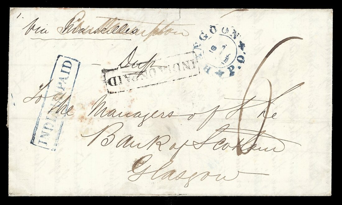 1858 (1 Feb.) entire to Glasgow, marked "via Southampton", rated "6", showing