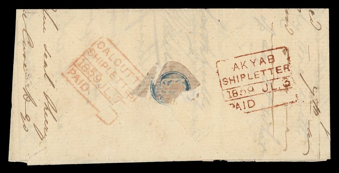 1859 (3 July) ½a. stationery letter sheet to Calcutta, marked "Per Baltic", crossed by manuscript "Stamped", cancelled by unclear Bengal obliterator and showing, on reverse, fine framed