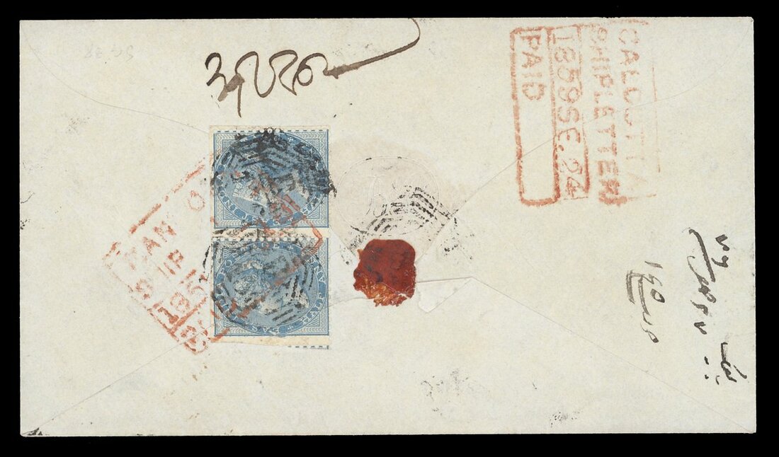 1859 (18 Sept.) envelope to Calcutta, marked "Per str Baltic" and bearing, on reverse, ½a. pair (some perfs cut off) cancelled "B/156" and tied by framed