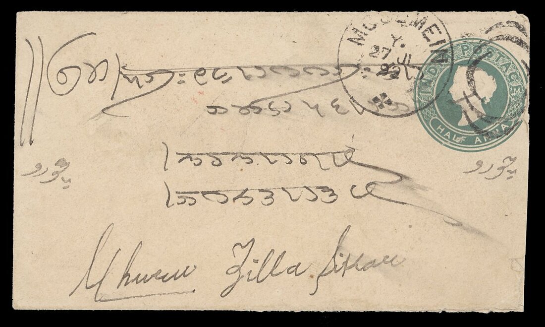 1892 (27 July) ½a. stationery envelope to India, clearly cancelled by Moulmein Crescent duplex, fine Very scarce