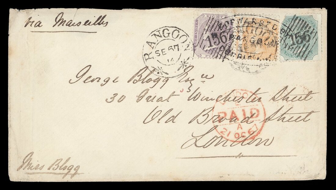 1867 (14 Sept.) envelope to London, marked "via Marseilles", bearing 8p., 2a. and 4a. (damaged) tied by firm's chop and two clear strikes of