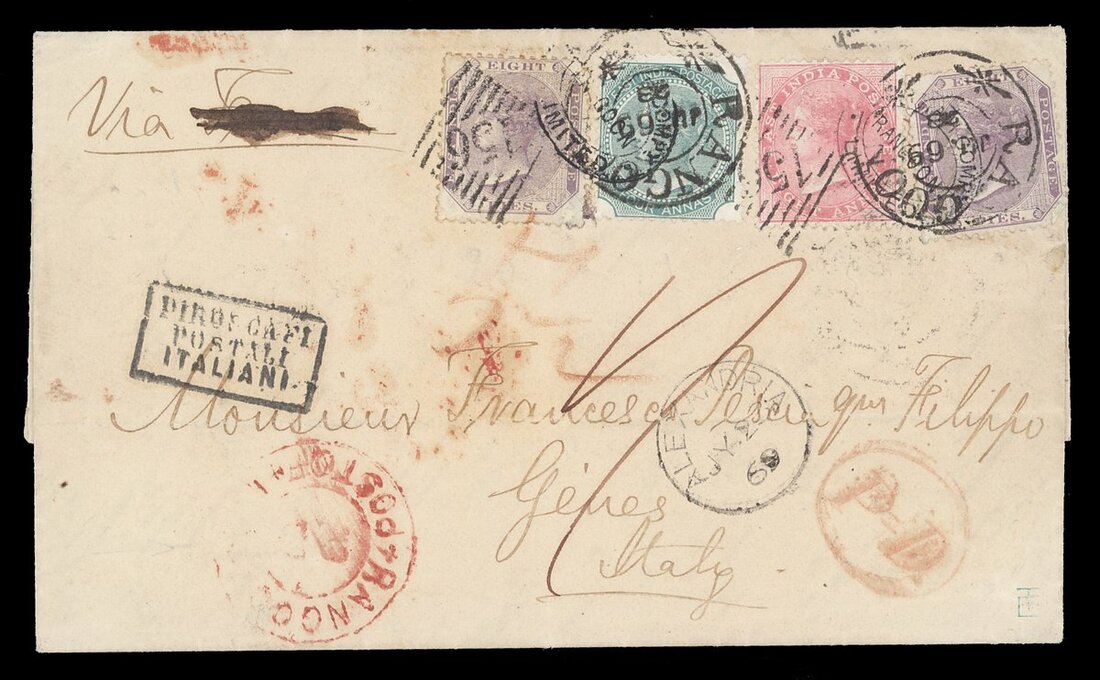 1869 (21 June) entire letter to Genoa, bearing 8p. (2), 4a. and 8a., all three with firm's chop and tied by