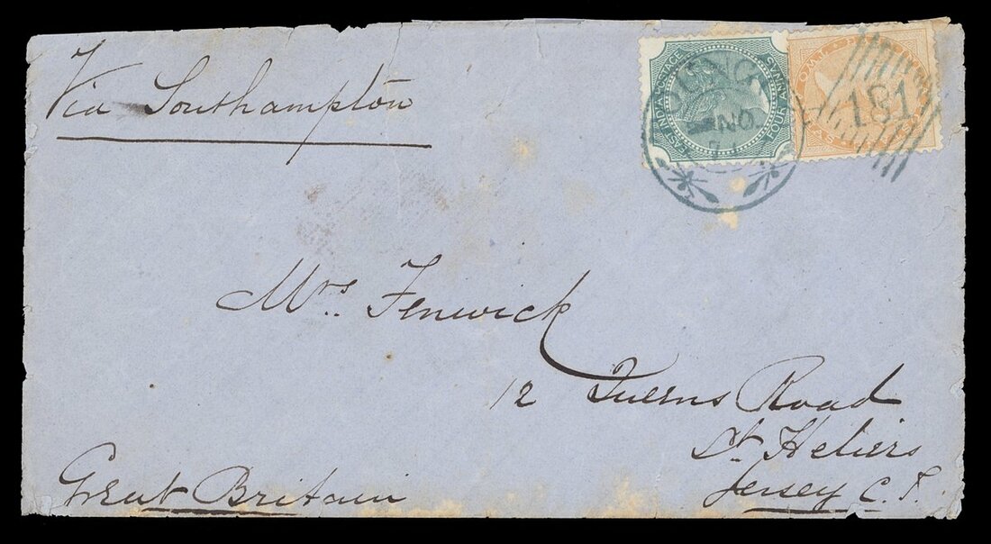 1871 (Nov.) envelope to Jersey, marked "Via Southampton", bearing 2a. and 6a. clearly tied by fine