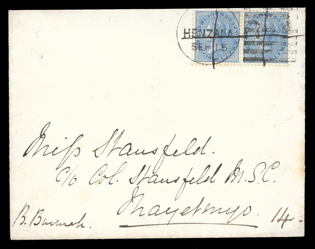 1876 (15 Sept.) envelope (flap missing) to Thayetmyo, bearing ½a. pair tied by pen strokes and cancelled by