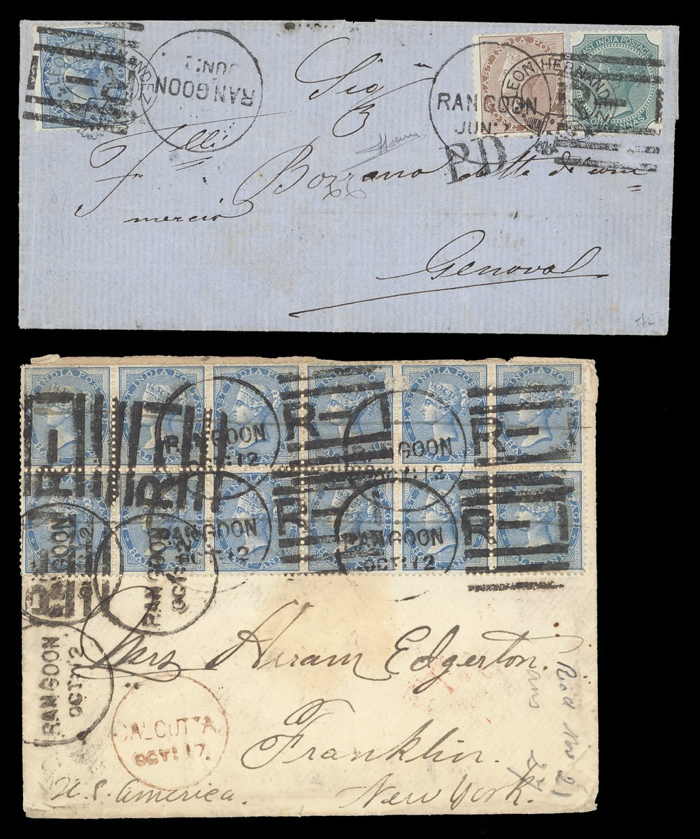 1876 (1 June) envelope to Genoa via Calcutta, Sea Post Office and Brindisi, bearing ½a., 1a. and 4a., and 1881 (12 Oct.) envelope to New York via Calcutta and London, bearing ½a. (18, six on reverse), all clearly tied by