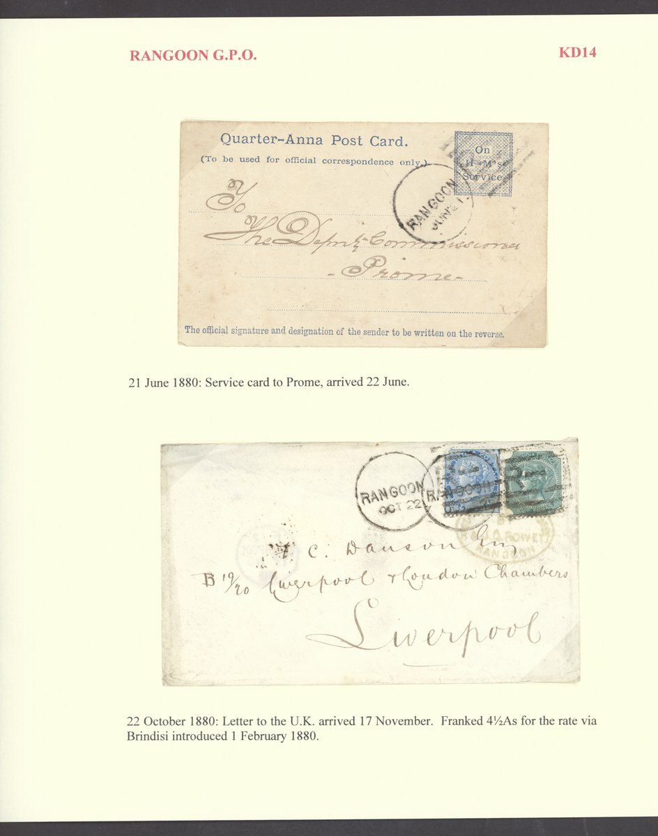 1880 (21 June) ½a. stationery card to Prome, 1880 (22 Oct.) and 1881 (Mar.) envelopes to Liverpool bearing ½a. and 4a., 1881 (19 May) envelope to USA bearing ½a. pair and 2a., and 1881 (12 Nov.) envelope to Bombay redirected to London and again to Wimbledon bearing 1a., all tied by