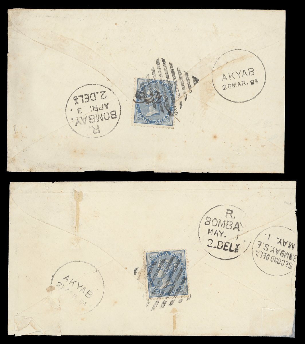 1884 (26 Mar.) and (21 Apr.) envelopes to Bombay bearing, on reverse, ½a. tied by diamond of bars (Type K10) and showing