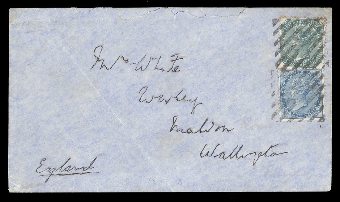 188? (13 Dec.) envelope ex the White correspondence to Malvern, bearing ½a. and 4a. (some stained perfs at top) tied by fine diamond of bars and showing, on reverse,
