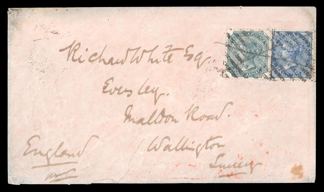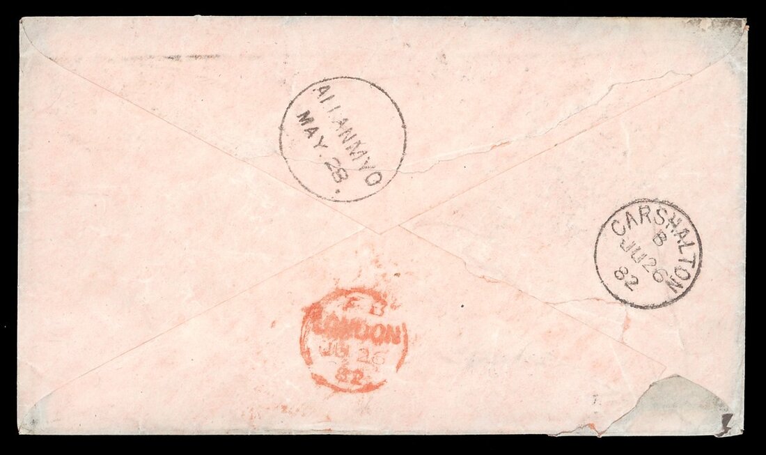 1882 (28 May) pink envelope ex the White correspondence to Surrey, bearing ½a. and 4a. crossed by ink strokes, cancelled by diamond of bars (Type K1) and showing, on reverse,