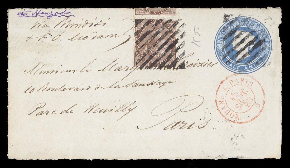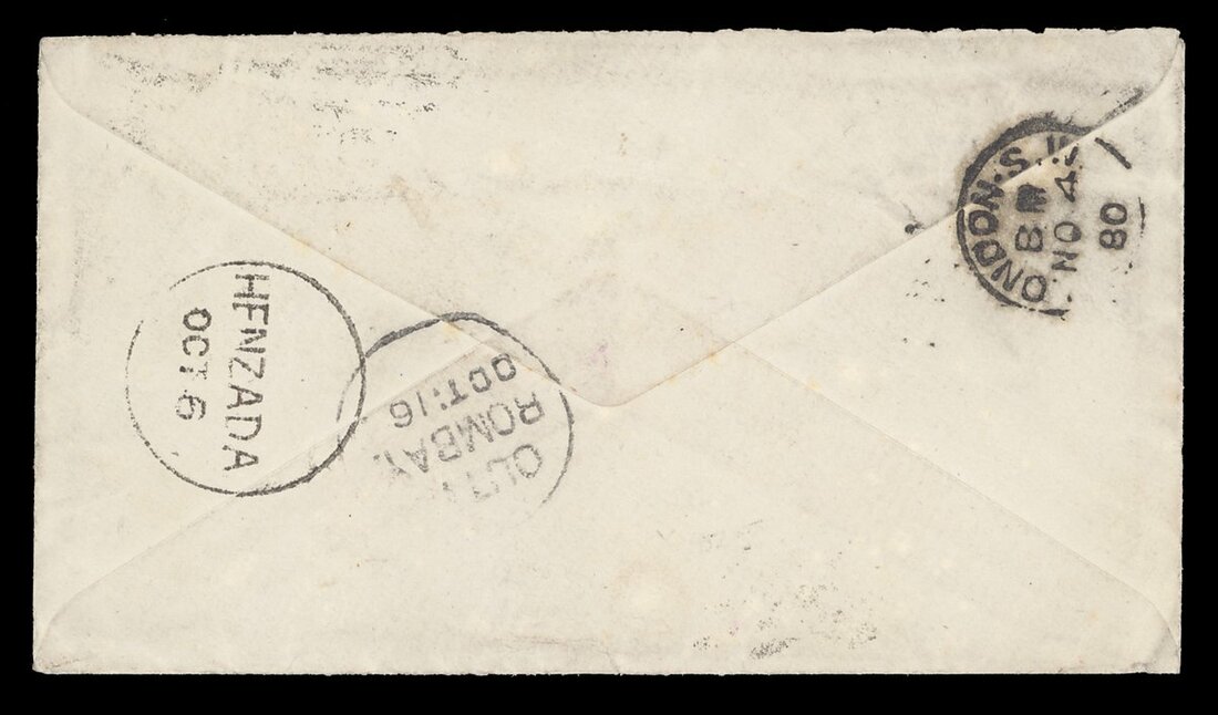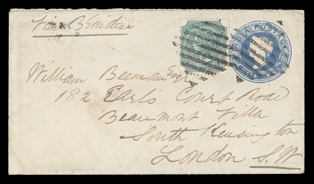 1880 (6 Oct.) ½a. stationery envelope to London uprated with 4a., both cancelled by diamond of bars (Type K5) and showing, on reverse,
