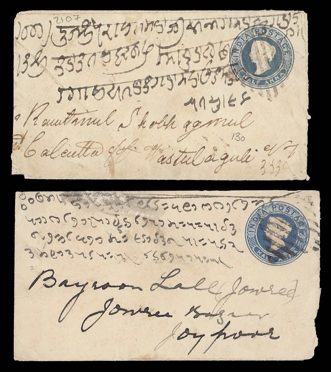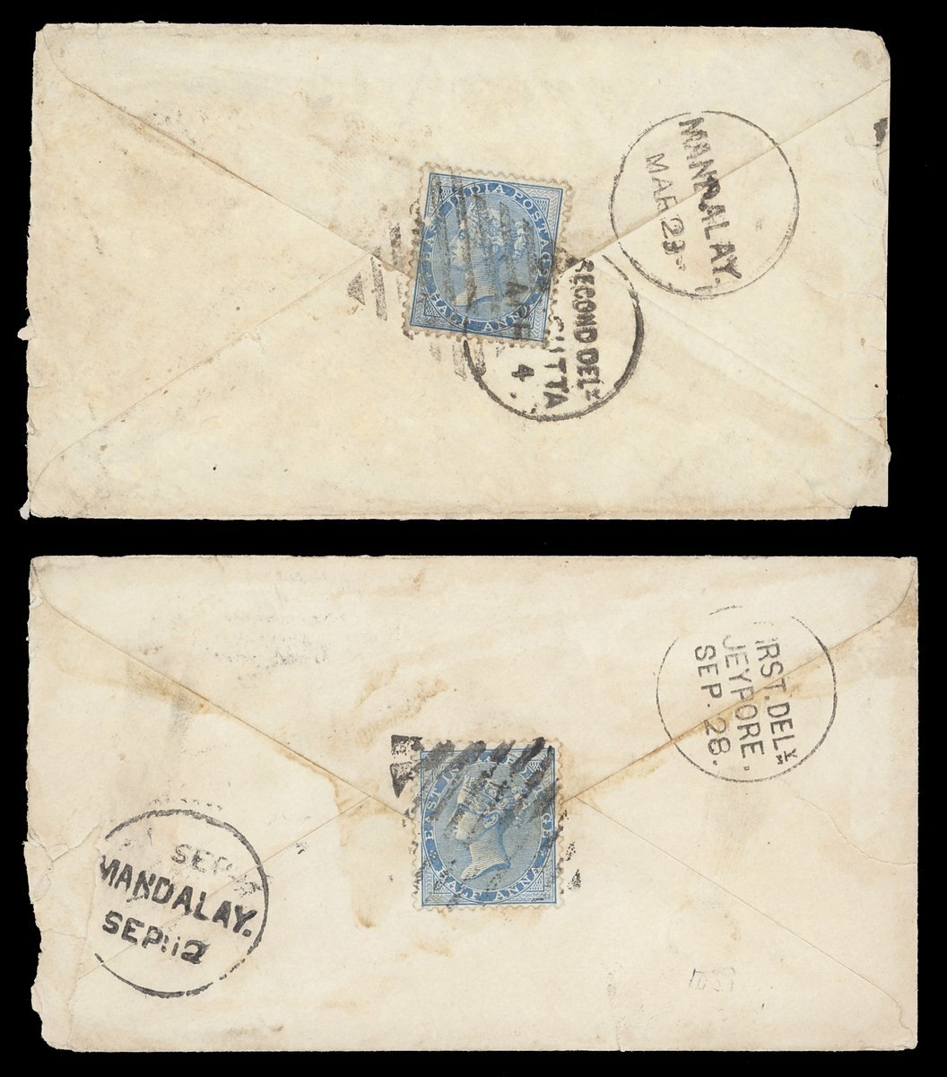 Undateable ½a. stationery envelopes (2) to India bearing, on reverse, ½a. , both cancelled by diamond of bars (Type K4) and showing