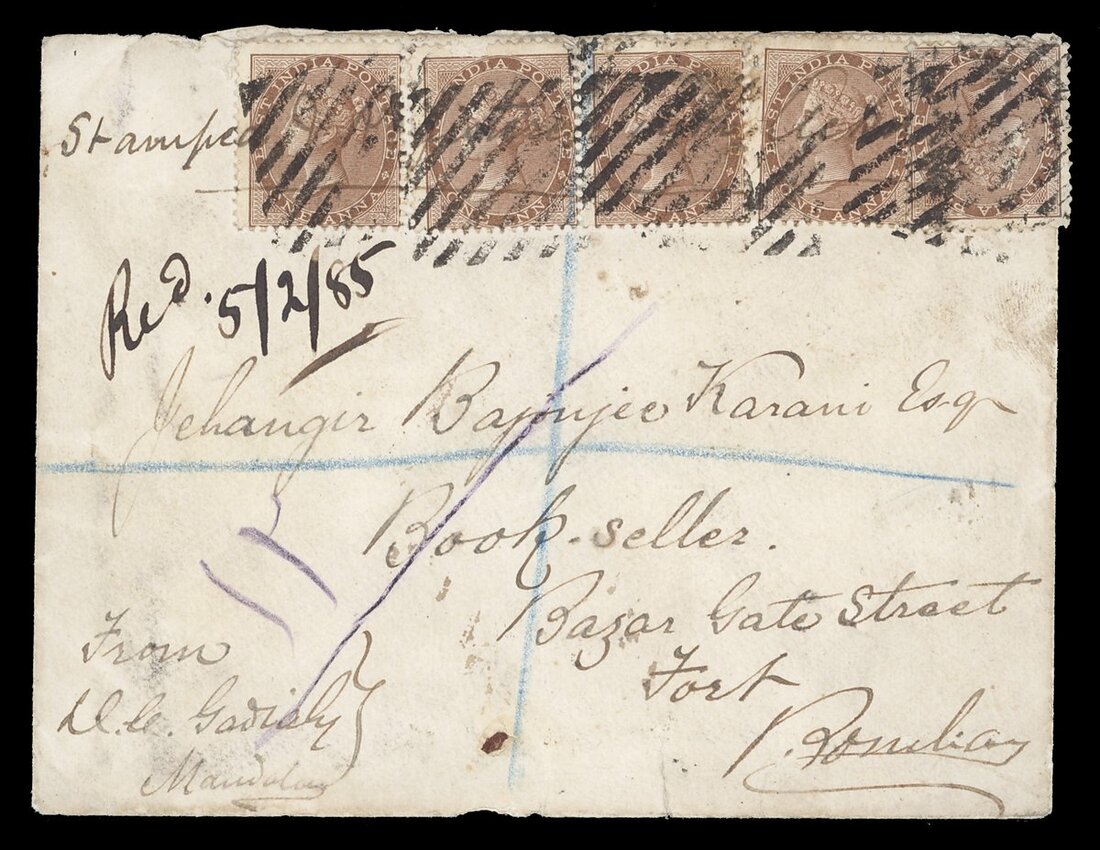 1885 (17 Jan.) envelope registered to Bombay, bearing 1a. (5) crossed by manuscript "Stamped", tied by diamond of bars (Type K4) and showing, on reverse,