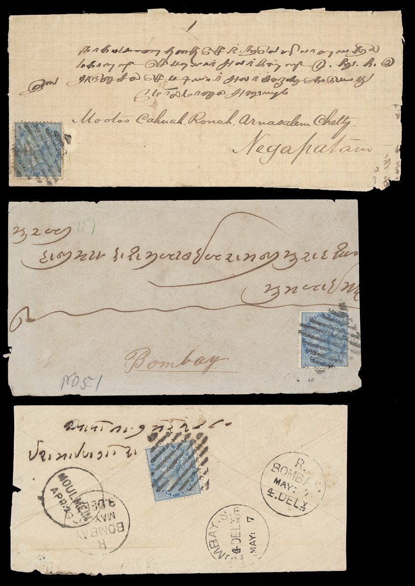 Undated envelopes (3) to India bearing ½a. tied by diamond of bars (Type K11) and showing