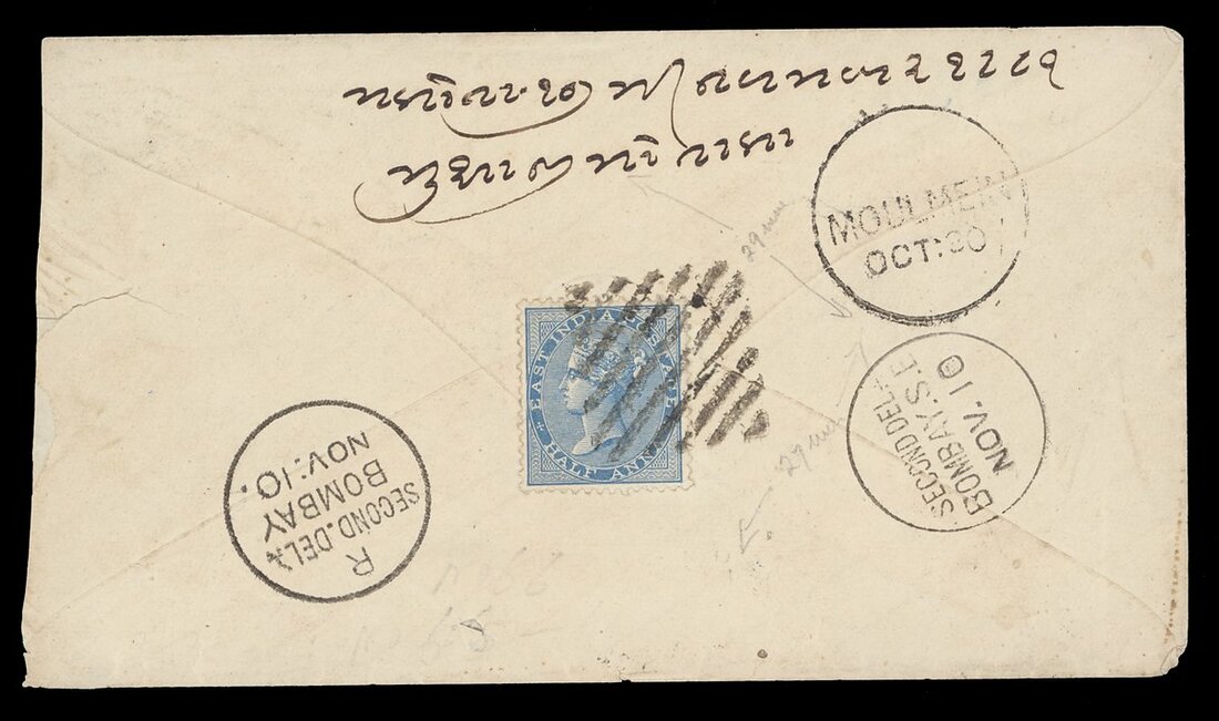 c.1880 envelope to Bombay bearing, on reverse, ½a. tied by diamond of bars (Type KD11) with